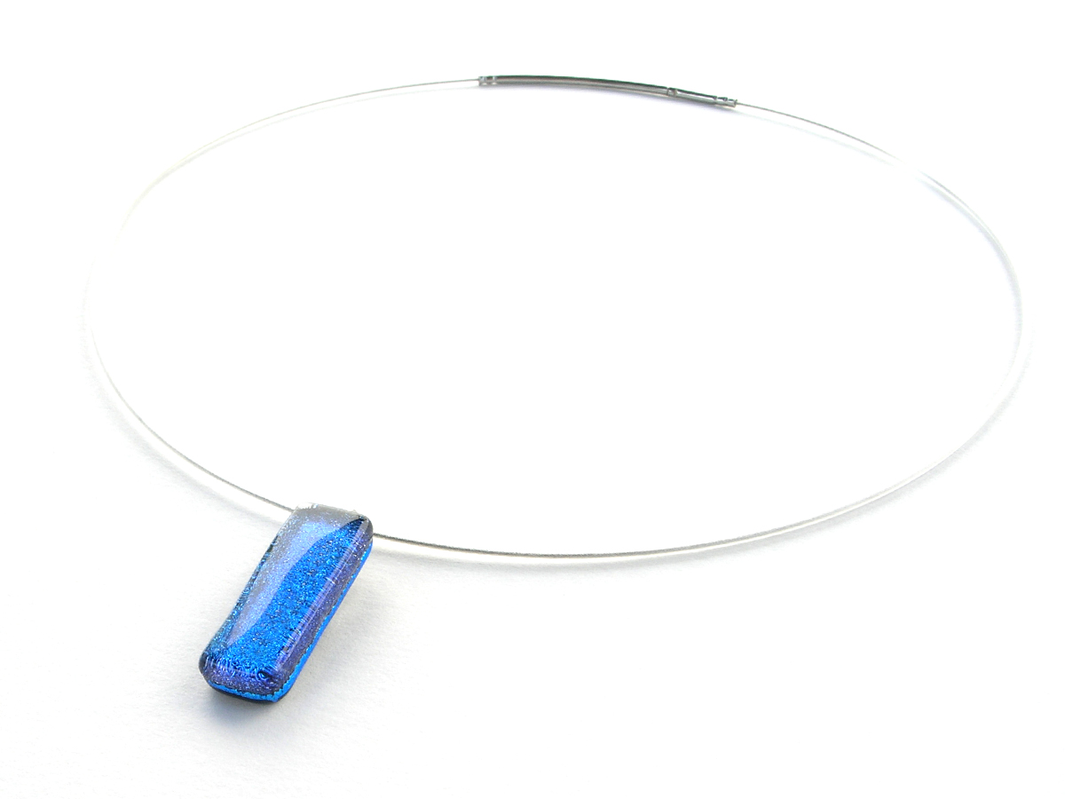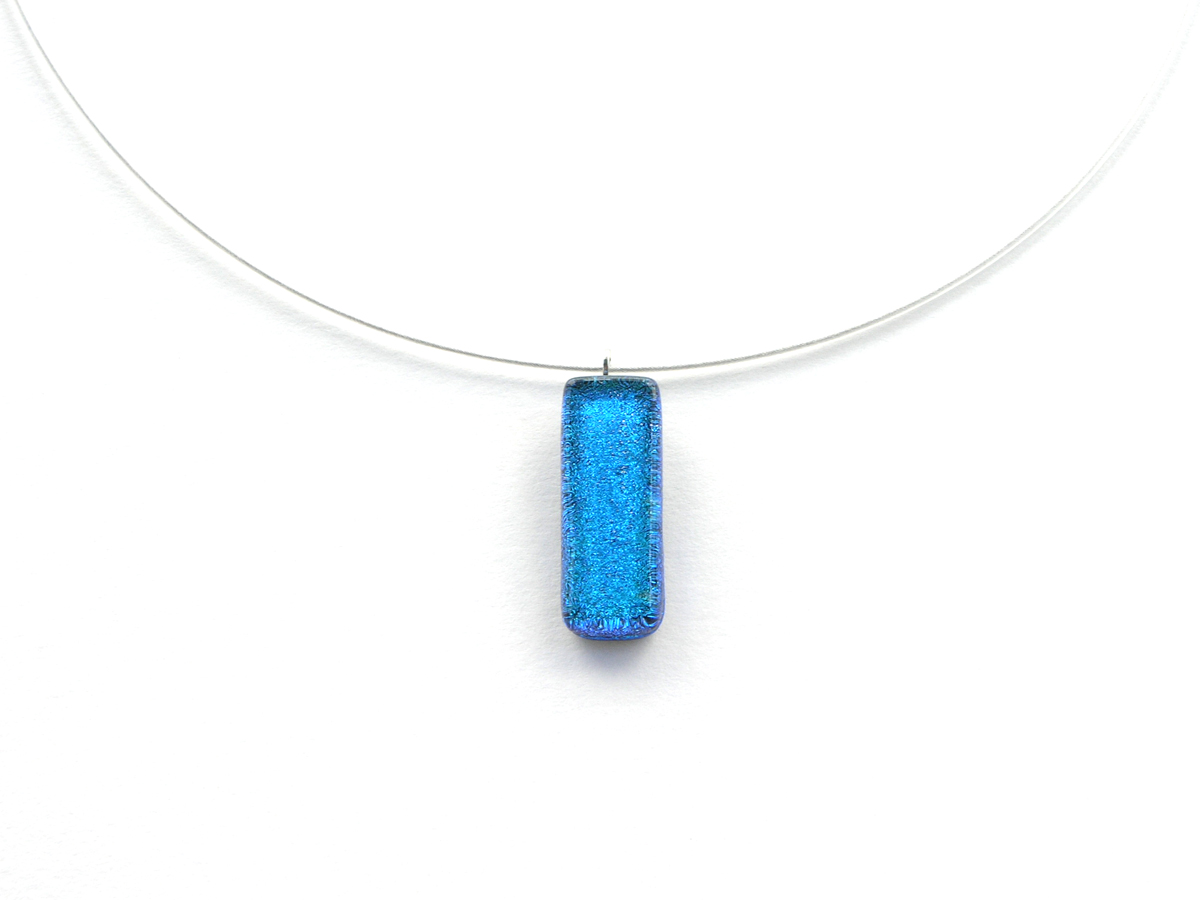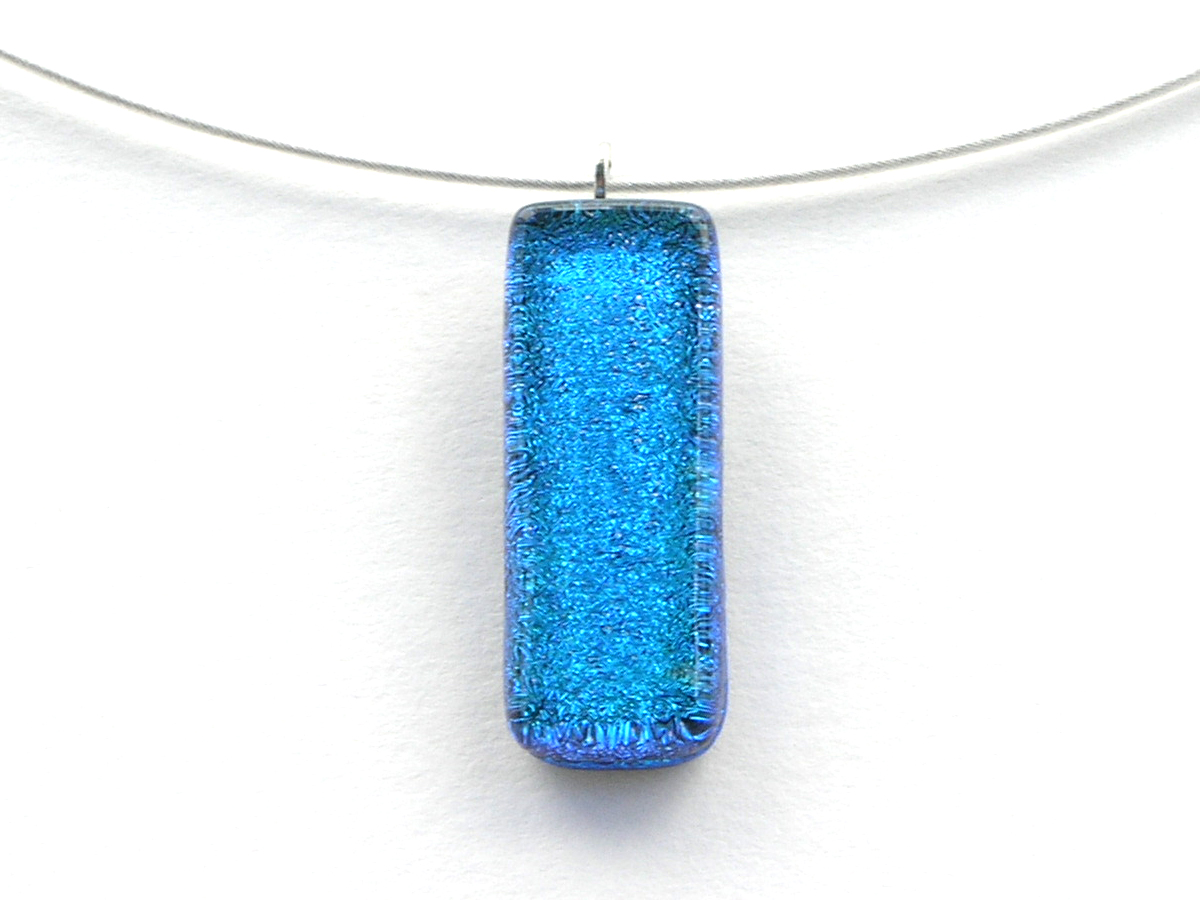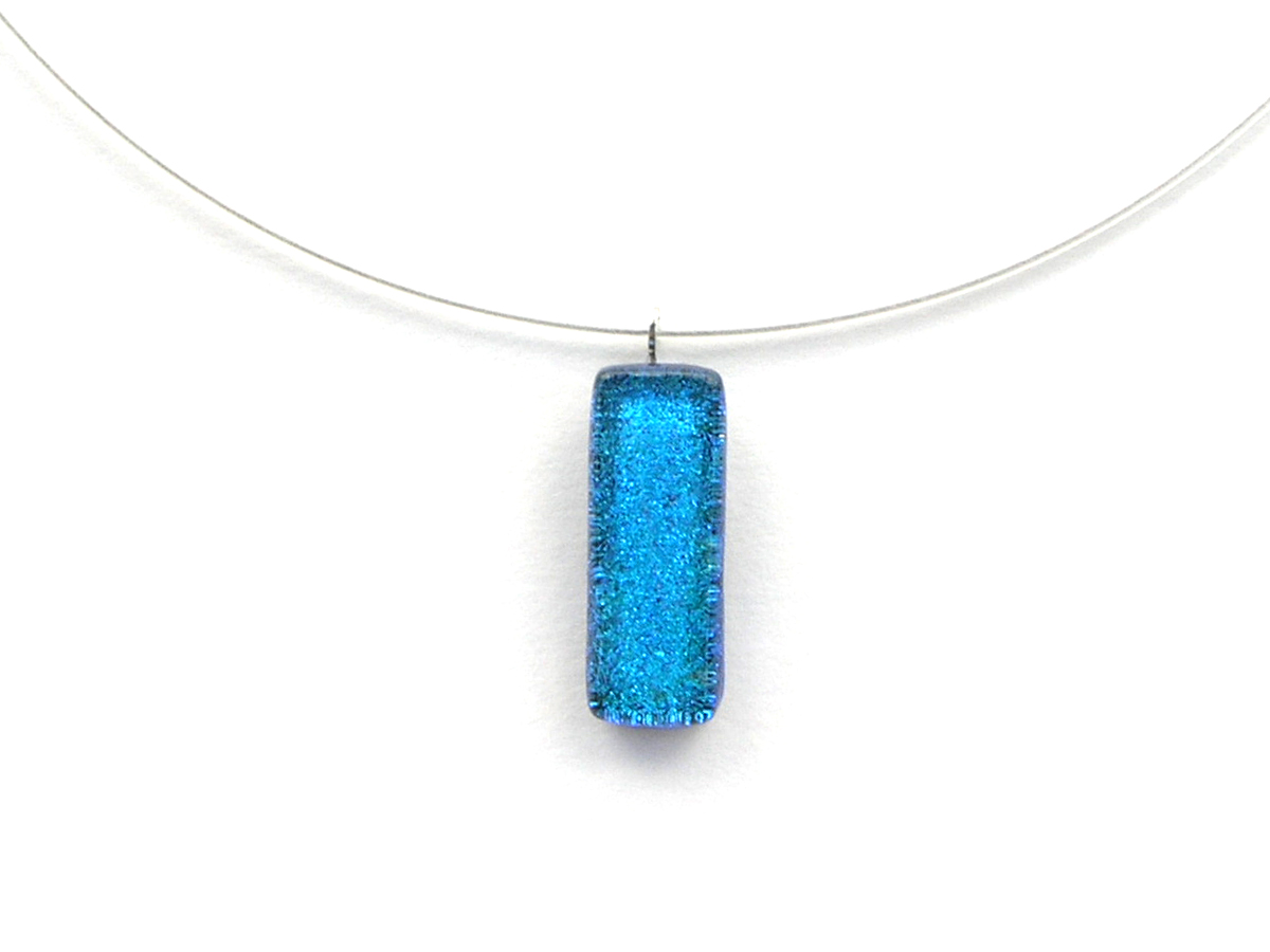 Diese Dichroic Halskette hat einen Anhänger aus Glas in der Größe von ca. 2,5cm x 0,75cm und wiegt ca. 10g. Die Grundfarbe dieses Anhängers ist türkis.