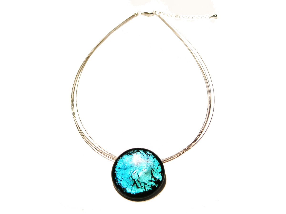 Für die Direct Glasschmuck Serie verwendet die Kunsthandwerkerin Birgit Sänger von der Galerie Glaswerk kleine Glaselemente, die im Schmelzofen unter hohen Temperaturen zu diesem Modeschmuck Anhänger geschmolzen werden. In Kombination mit Klarglasschichten entsteht eine starke Tiefenwirkung und schöne Reflektionseffekte.