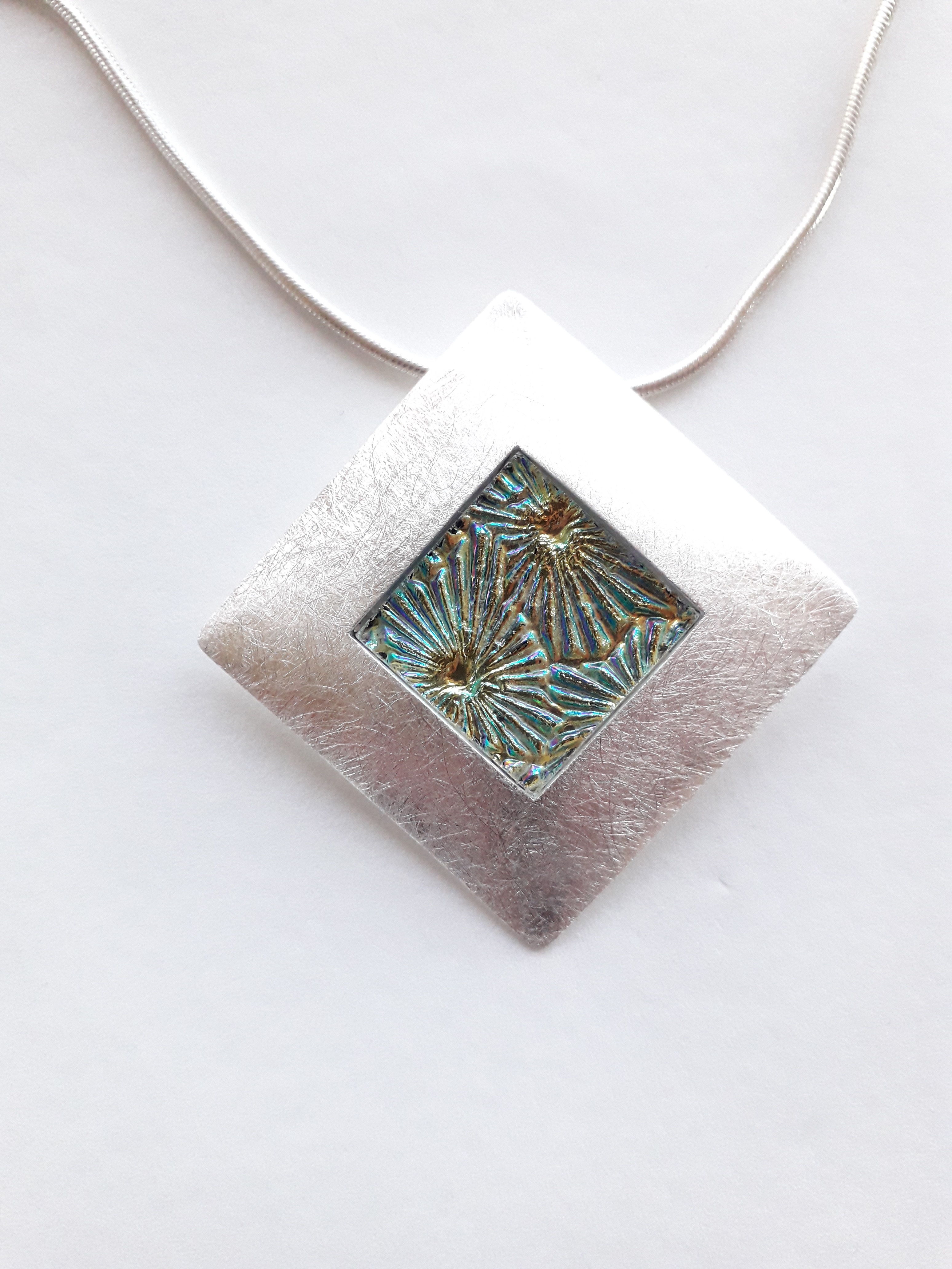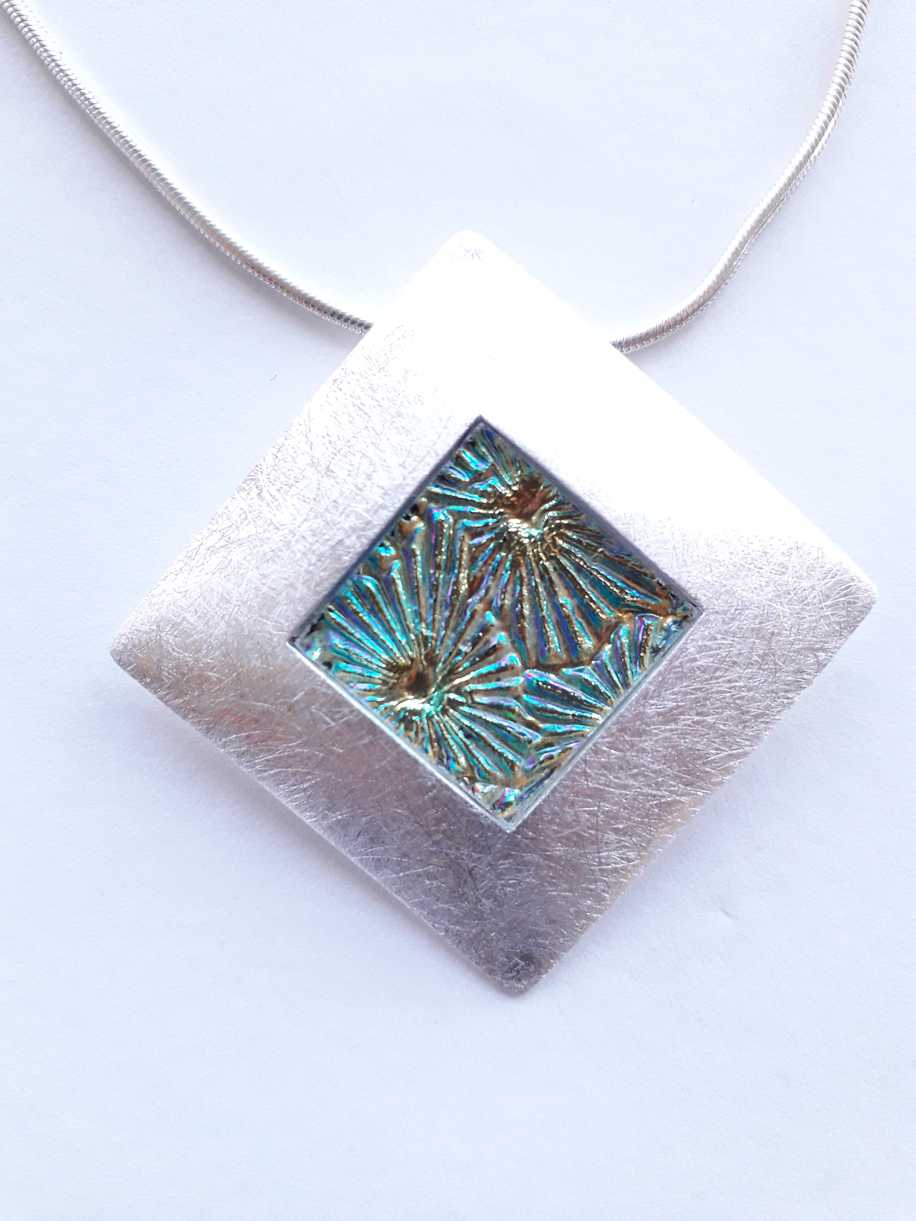 Als Basis für die Echtsilber Glasschmuck Anhänger werden hochwertige 925 Echtsilber Anhänger verwendet. Die Kombination von Aventurin, Silber und/oder Gold, sowie Dichroic Glas auf den Schmuckstücken eröffnet bei verschiedenem Einfall von Licht, eine vielzahl von Farben und Strukturen. Das farbig- transparente Glas, mit dem die Schmucksteine im Echtsilber-Anhänger überzogen werden sorgt für Tiefe, Glanz und wunderschöne Farbeffekteeffekte.