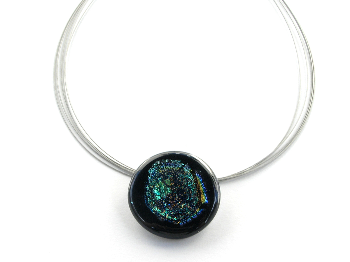 Alle Schmuckstücke sind Arbeiten der Galerie Glaswerk. Kleine Glaselemente, werden im Schmelzofen unter hohen Temperaturen zugeschmolzen oder in freier Formgebung vor dem Glasbrenner gestaltet. Durch Klarglasschichten entsteht eine starke Tiefenwirkung und sehr schöne Reflektionseffekte.