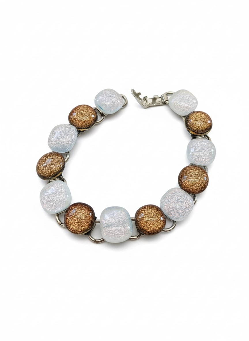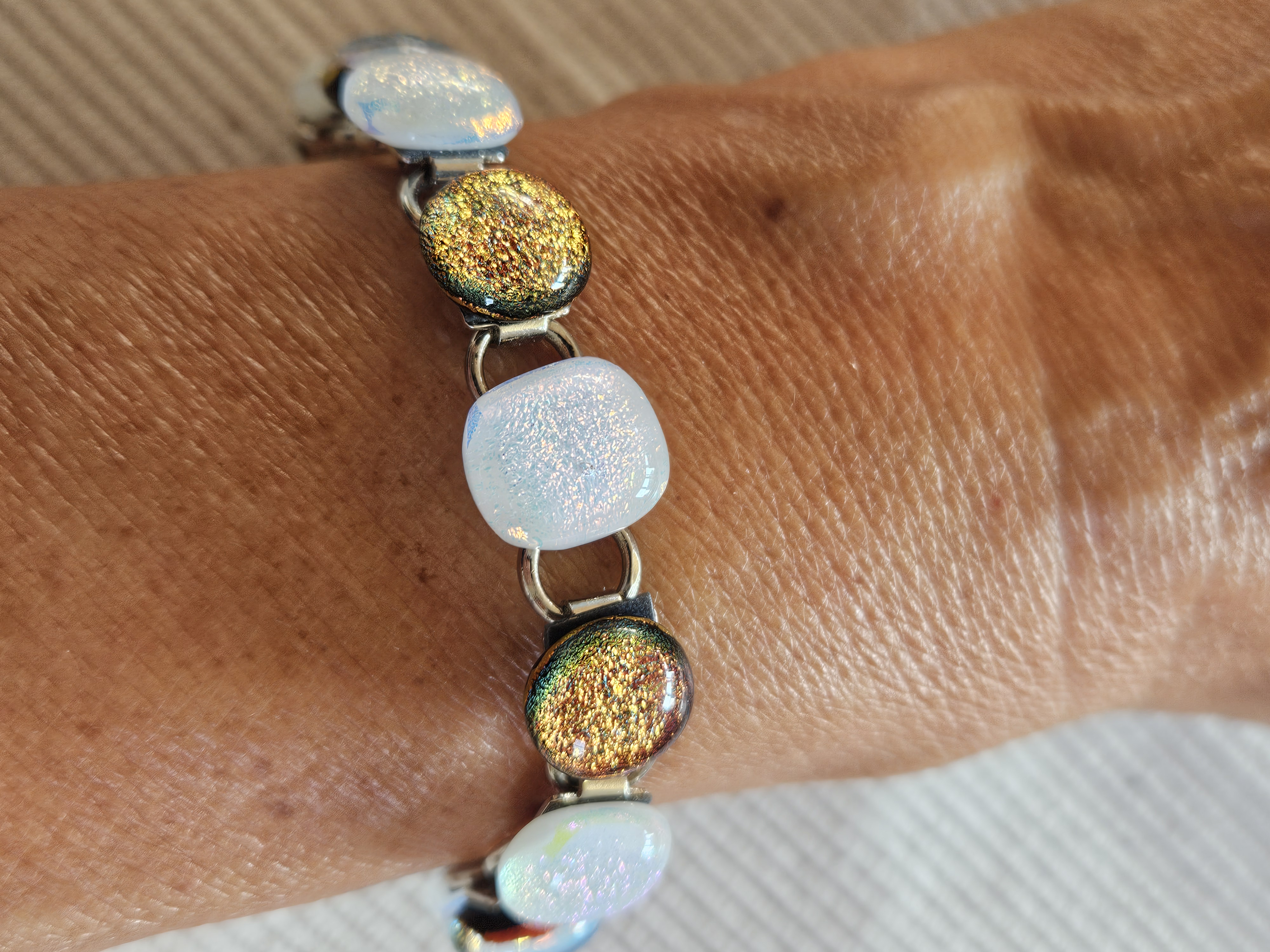 Alle Schmuckstücke sind Arbeiten der Galerie Glaswerk. Kleine Glaselemente, werden im Schmelzofen unter hohen Temperaturen zugeschmolzen oder in freier Formgebung vor dem Glasbrenner gestaltet. Durch Klarglasschichten entsteht eine starke Tiefenwirkung und sehr schöne Reflektionseffekte.