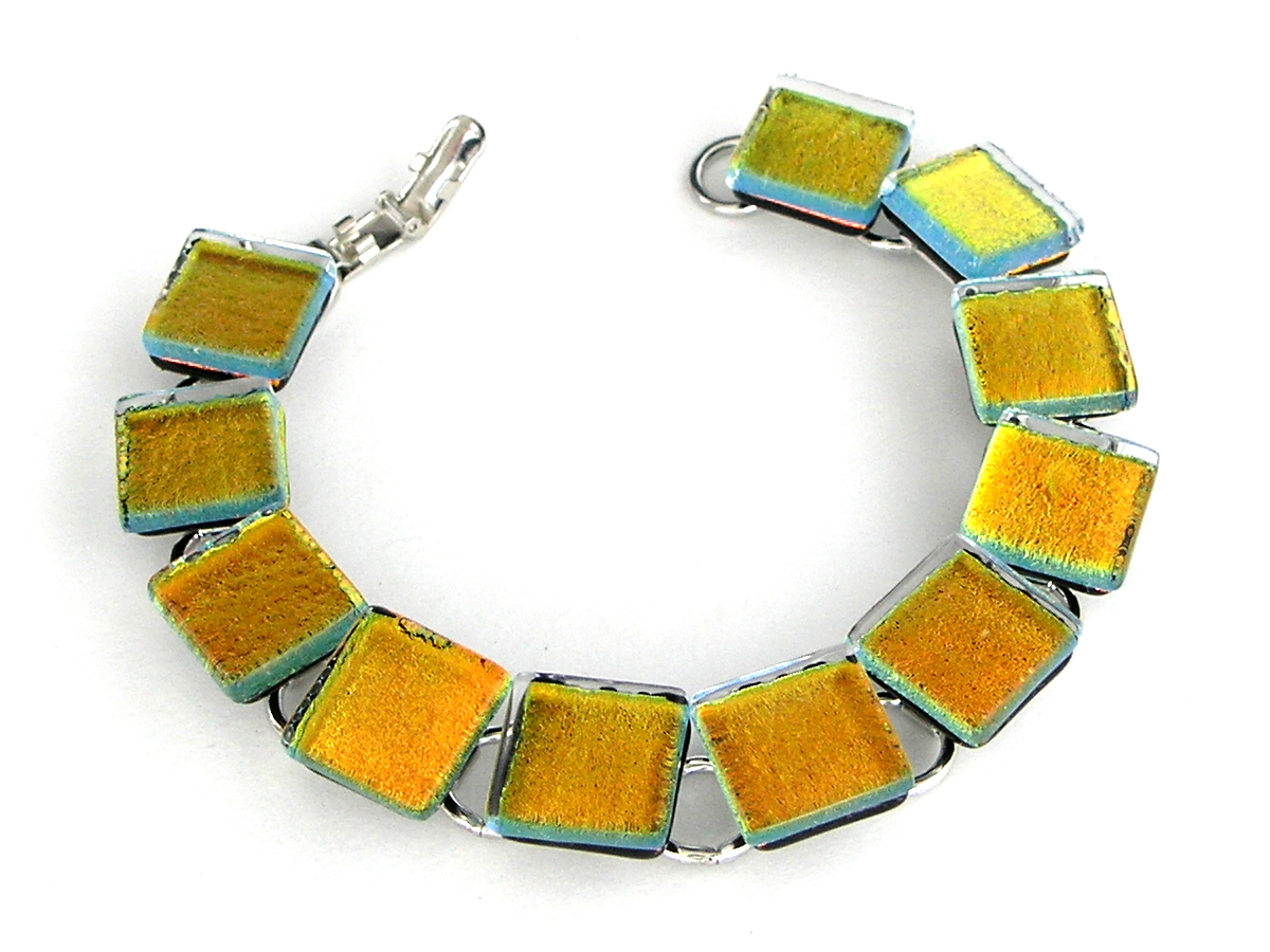 Die Schmuckstücke dieser Armkette haben eine Elementgröße von ca. 1cm x 1cm. Der Armschmuck aus Glas hat ein Gesammtgewicht von ca. 40g. Das Armband besteht aus 11 beweglichen Gliedern. Die Grundfarbe dieses Einzelelemente ist glas.