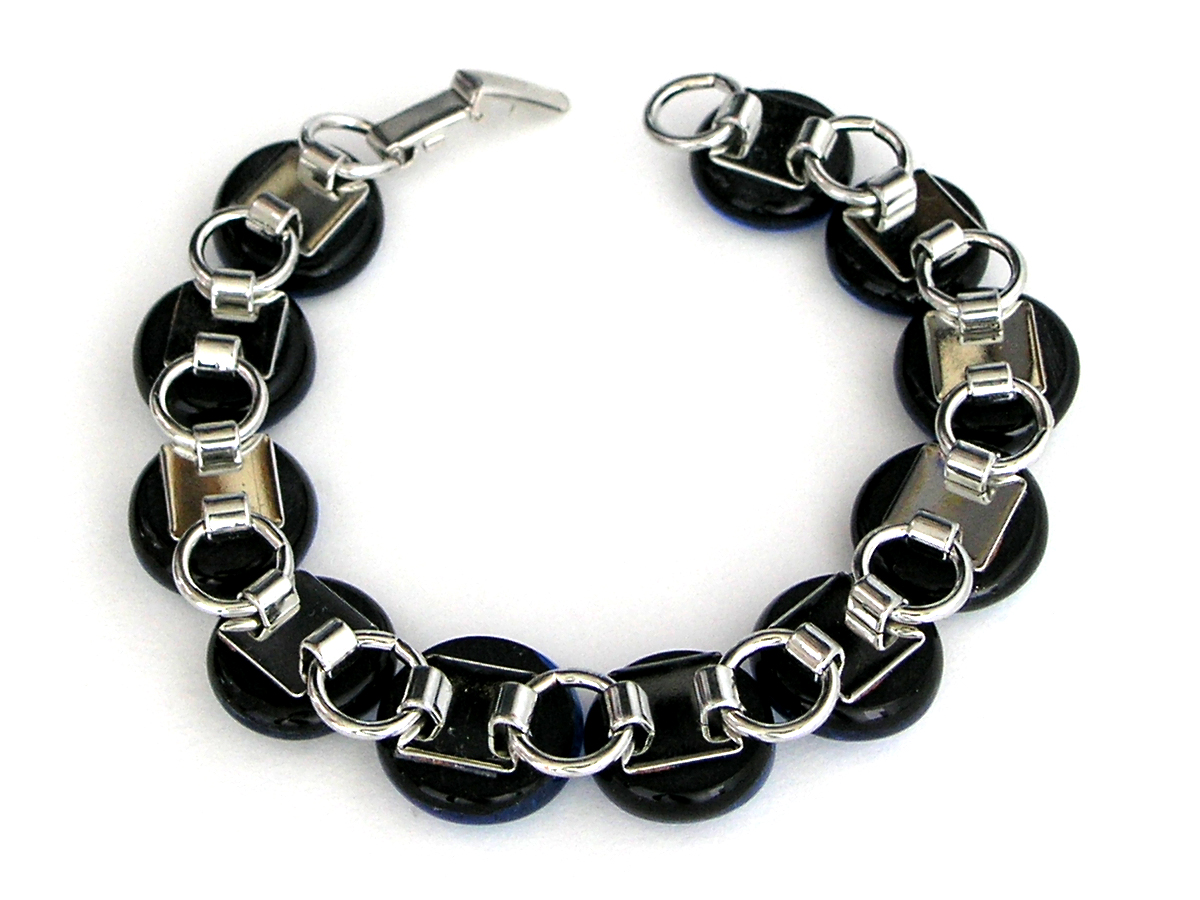 Das Armband besteht aus 11 beweglichen Gliedern. Die Schmuckstücke dieser Armkette haben eine Elementgröße von ca. 1cm x 1cm. Der Armschmuck aus Glas hat ein Gewicht von ca. 40g. Die Glaselemente sind auf schwarzer Grundfläche mit Farbglas verarbeitet.