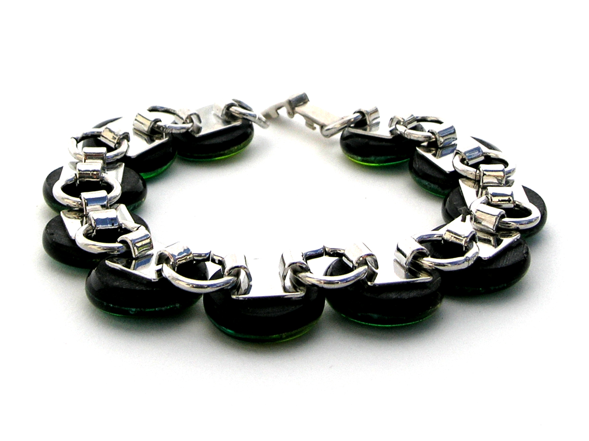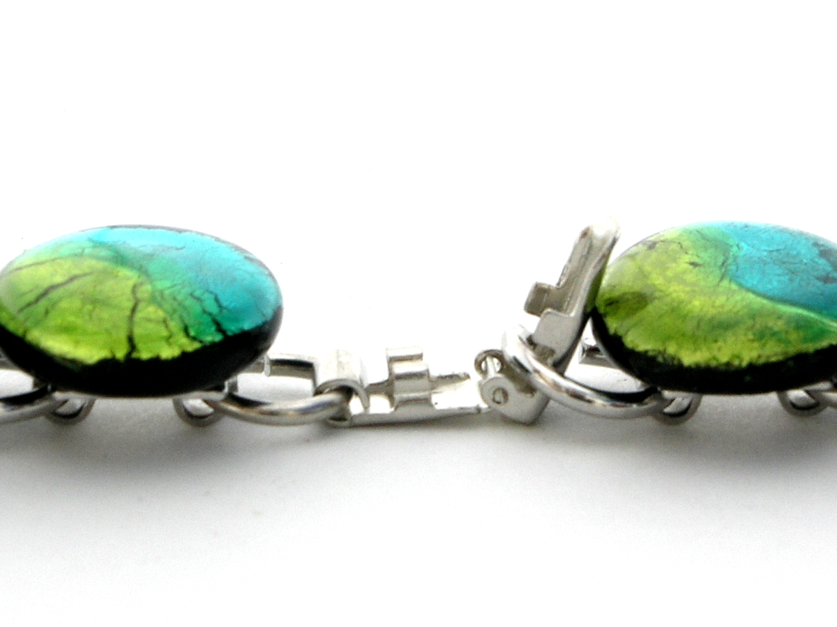 Die Armkettenmontur der 11 teiligen Glasschmuck Kette ist aus versilbertem Tombak. Jedes Element ist sicher mit der Montur verarbeitet. Die verwendete Schmuckbefestigung hat eine Zugfestigkeit von ca. 60kg/mm² und ist wasserfest und sogar Seifenwasserbeständig. Dieser Armschmuck hat eine Gesamtlänge von ca. 19cm (+ 1cm Verschluss). Er besteht aus mehreren beweglichen Gliedern und ist durch Ösen aus versilbertem Tombak sicher verbunden.