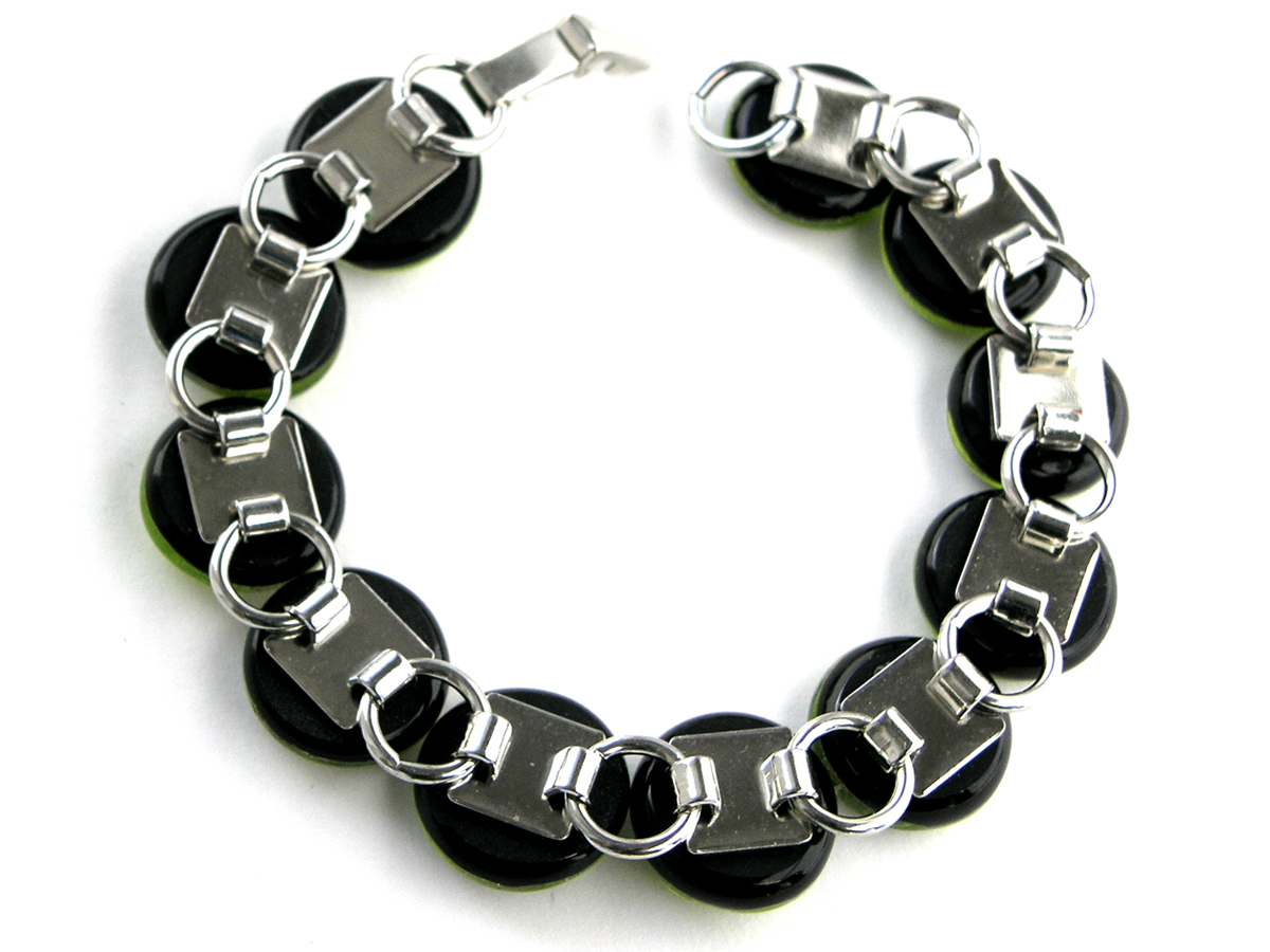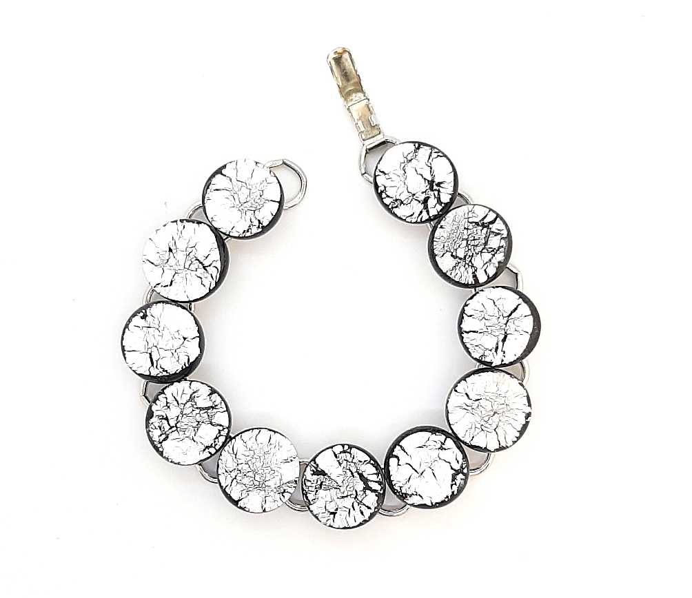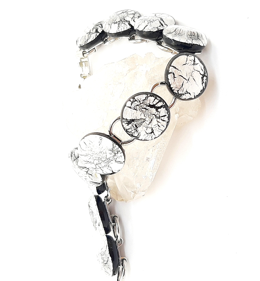 Das Armband besteht aus 11 beweglichen Gliedern. Die Schmuckstücke dieser Armkette haben eine Elementgröße von ca. 1cm x 1cm. Der Armschmuck aus Glas hat ein Gewicht von ca. 40g. Die Glaselemente sind auf schwarzer Grundfläche mit Farbglas verarbeitet.