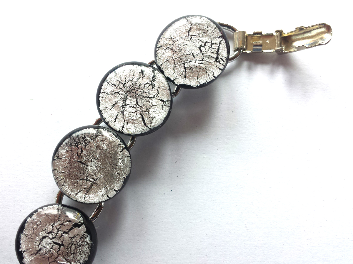 Die Formgebung der Glaselemente entsteht in freier Gestaltung vor dem Glasbrenner. Rainer Schrade, Glaskünstler der Galerie Glaswerk, verwendet zur Herstellung farbige Murano Glasstäbe die mit Blattsilber, Blattgold und Aventurin unter hohen Temperaturen zu diesem Modeschmuck Unikat geformt werden.