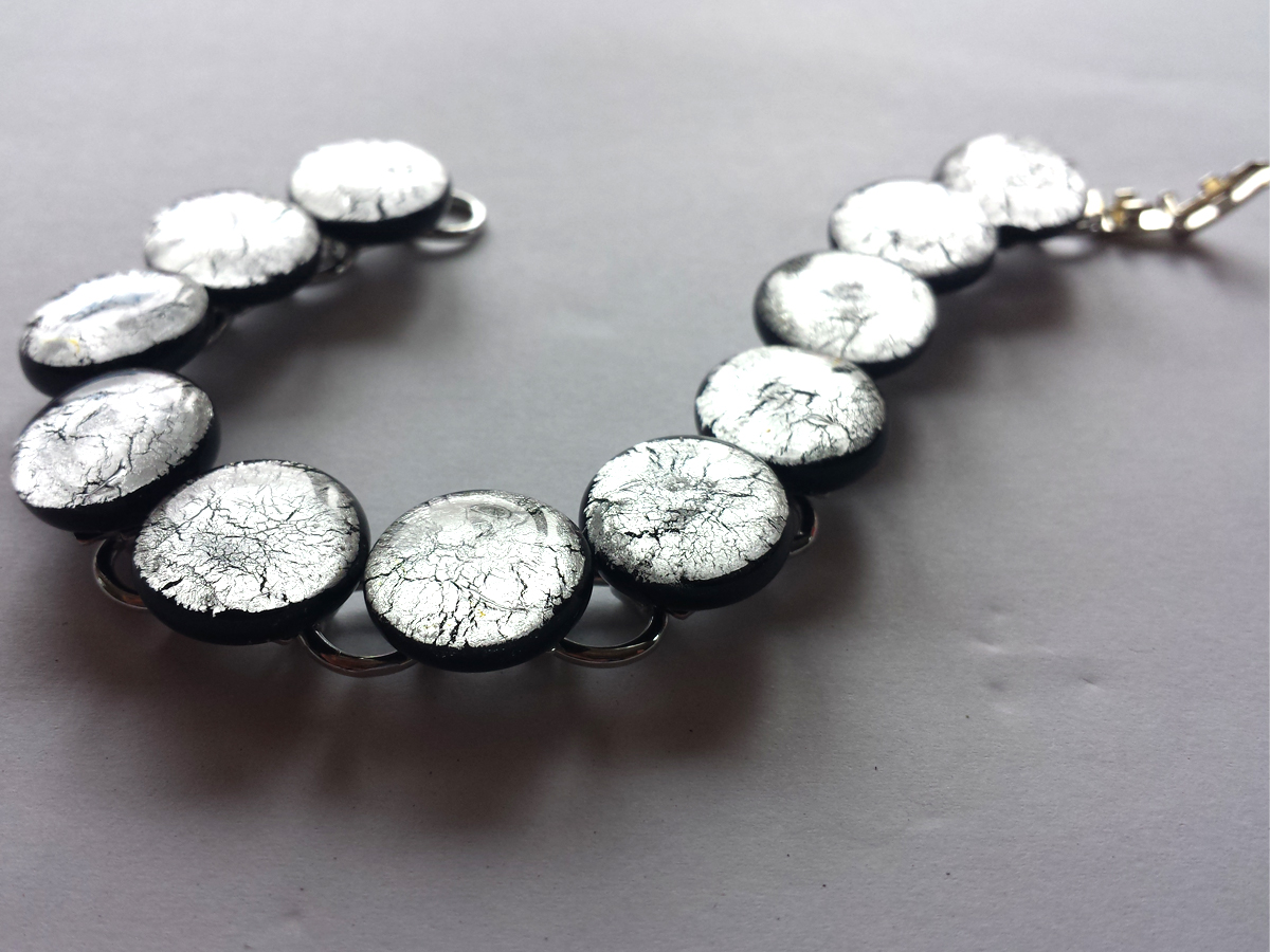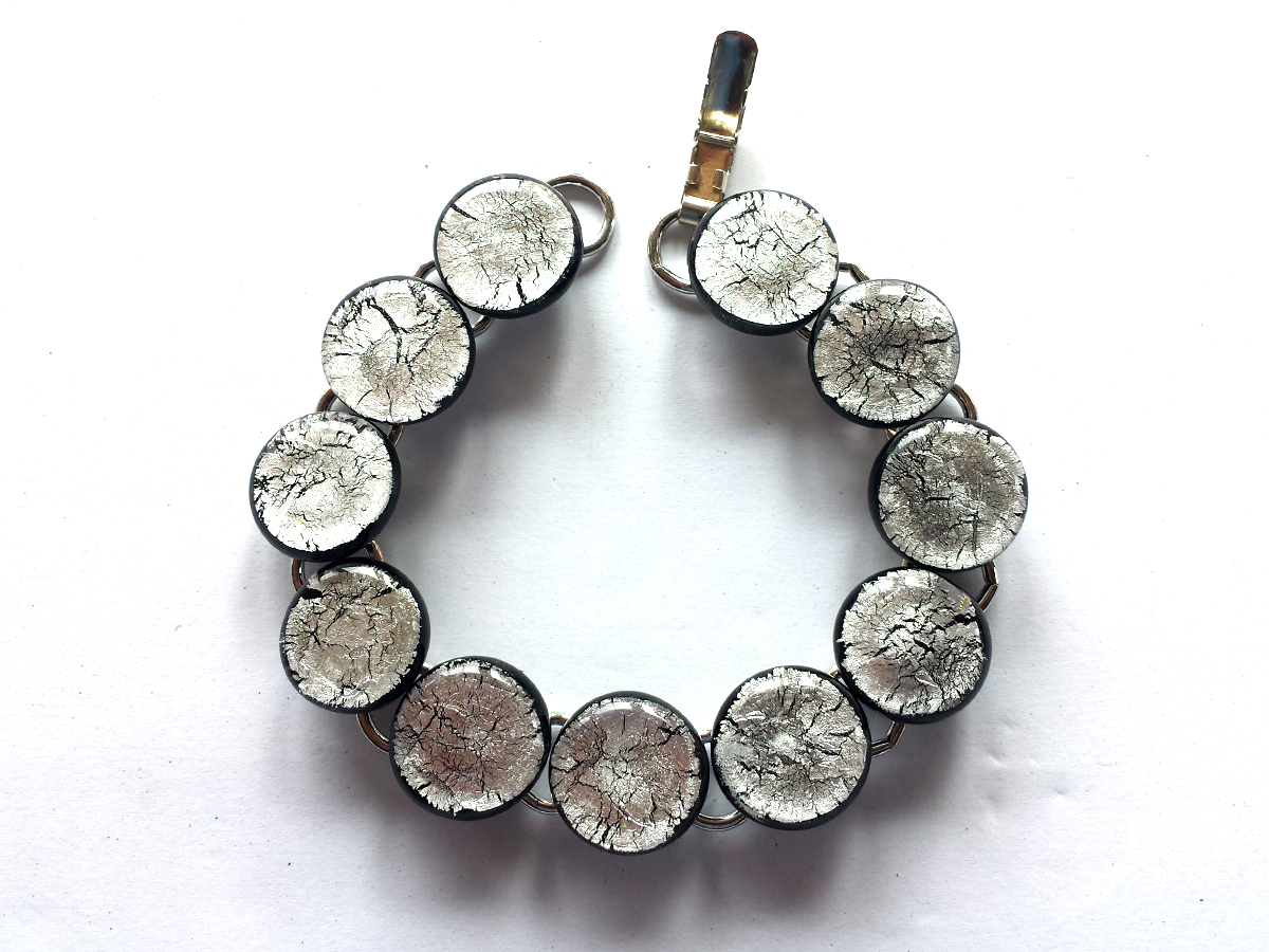 Die Armkettenmontur der 11 teiligen Glasschmuck Kette ist aus versilbertem Tombak. Jedes Element ist sicher mit der Montur verarbeitet. Die verwendete Schmuckbefestigung hat eine Zugfestigkeit von ca. 60kg/mm² und ist wasserfest und sogar Seifenwasserbeständig. Dieser Armschmuck hat eine Gesamtlänge von ca. 19cm (+ 1cm Verschluss). Er besteht aus mehreren beweglichen Gliedern und ist durch Ösen aus versilbertem Tombak sicher verbunden.