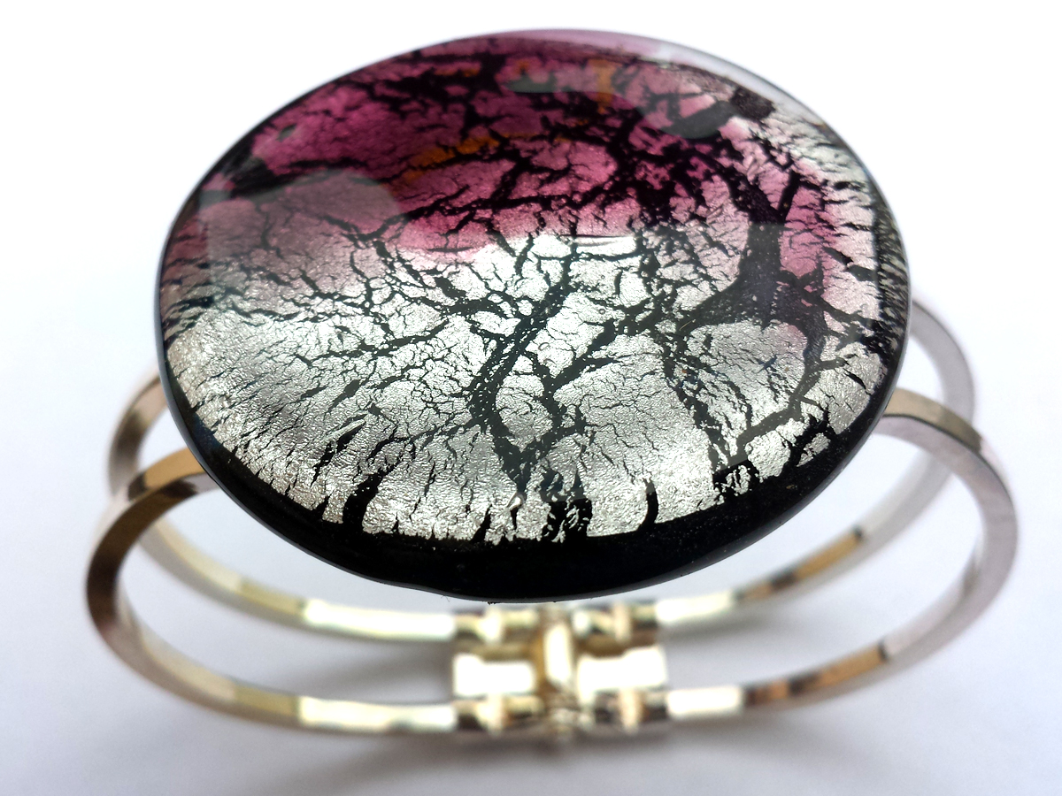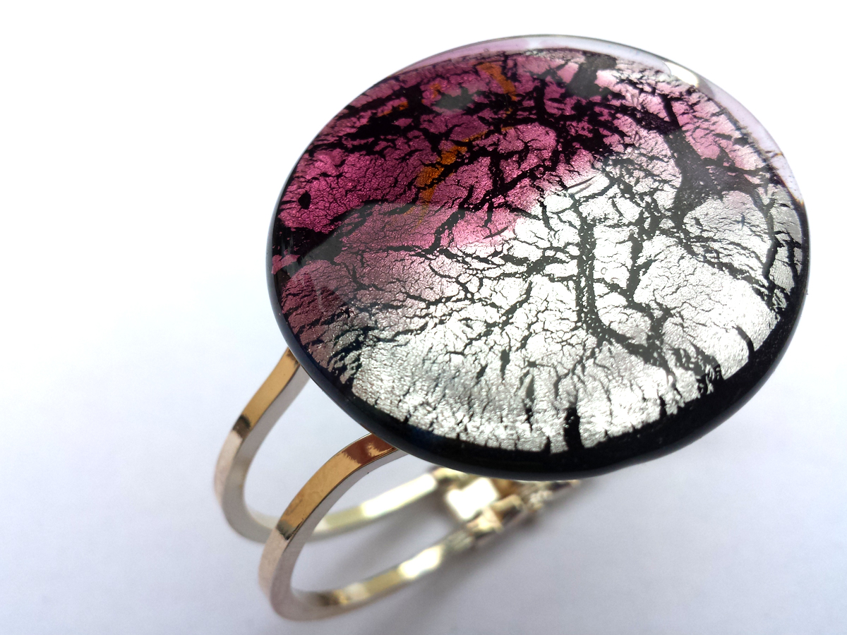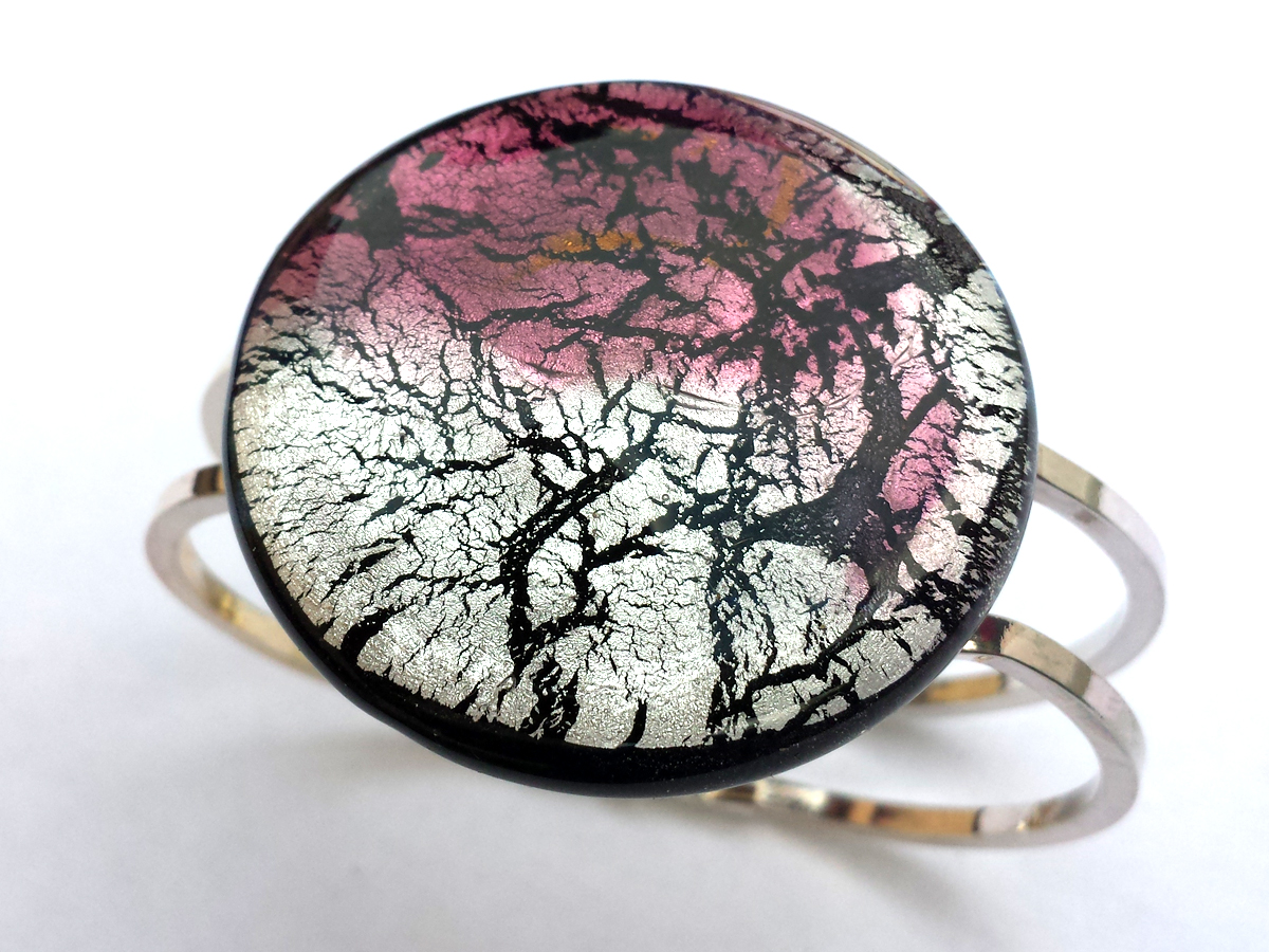 Die Glaselemente sind auf einem versilberten Rohling aus Tombak befestigt. Tombak ist eine (Messing-) Legierung aus 90 % Kupfer und 10 % Zink. Es hat die gleiche Ausdehnung wie Goldlegierungen und wird deshalb oft als Unterlagenmetall bei Schmuckstücken verwendet.