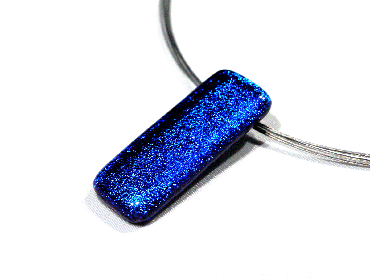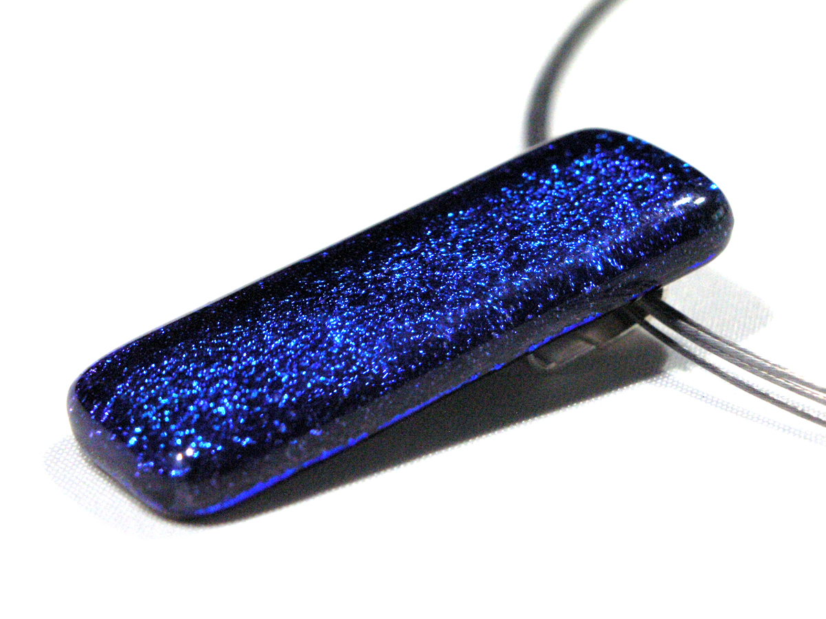 Diese Dichroic Halskette hat einen Anhänger aus Glas in der Größe von ca. 3cm x 1cm und wiegt ca. 15g. Die Grundfarbe dieses Anhängers ist blau.
