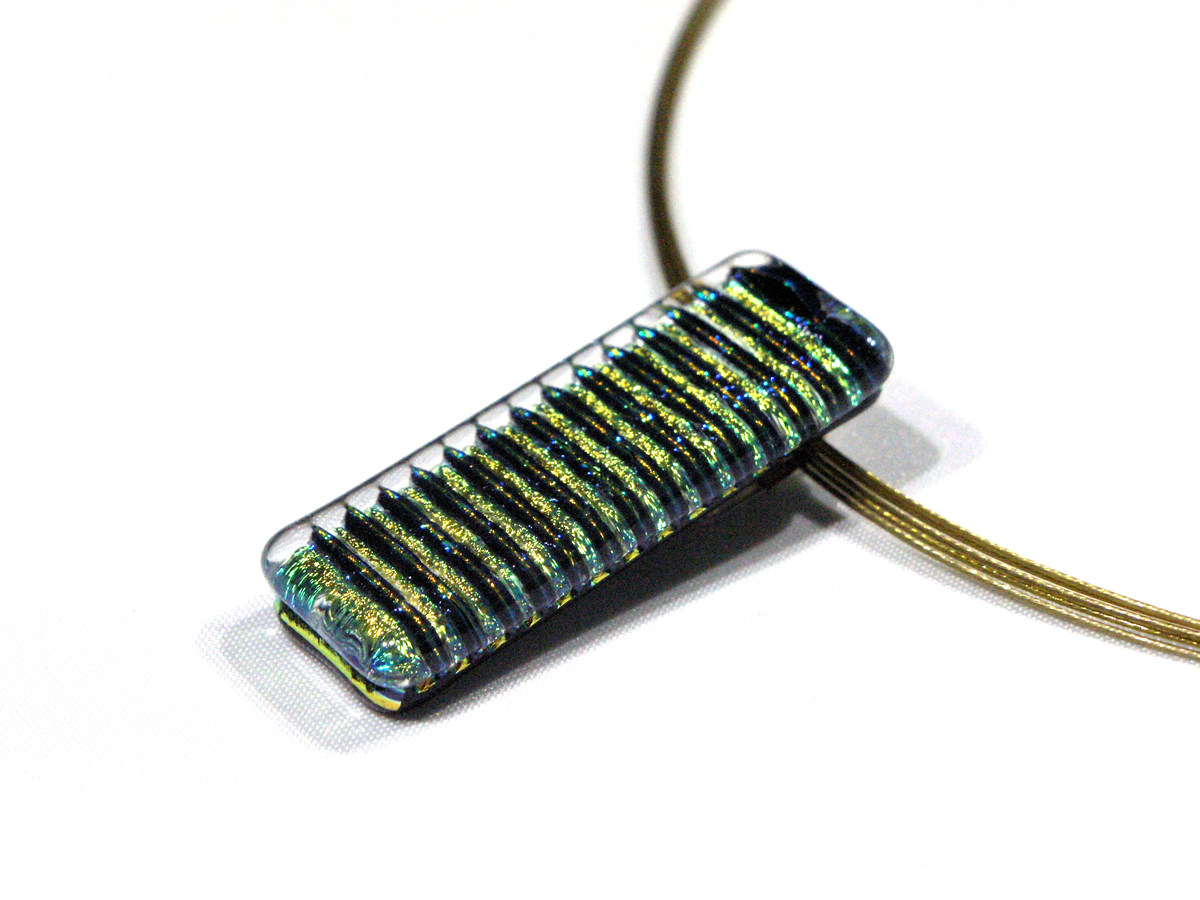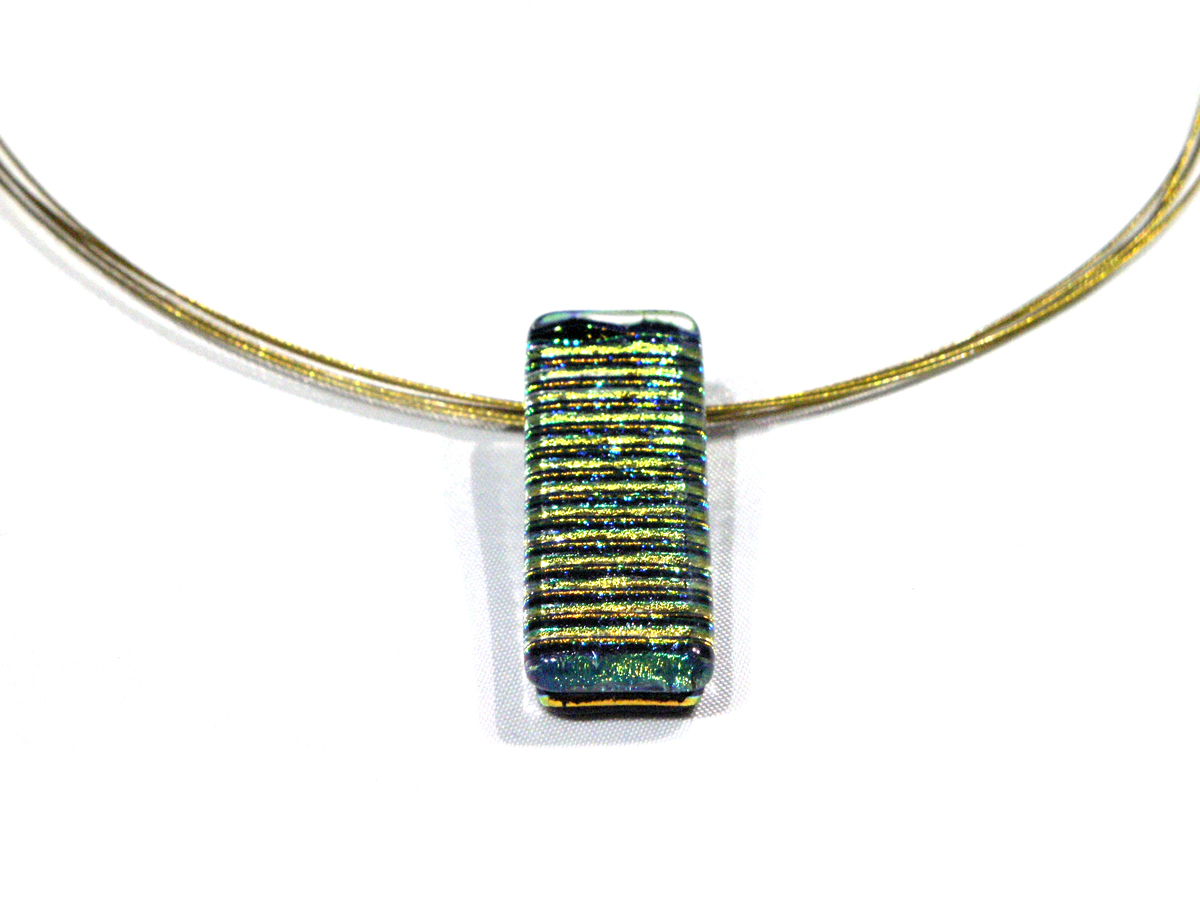 Diese Dichroic Halskette hat einen Anhänger aus Glas in der Größe von ca. 3cm x 1cm und wiegt ca. 15g. Die Grundfarbe dieses Anhängers ist gold streifen.