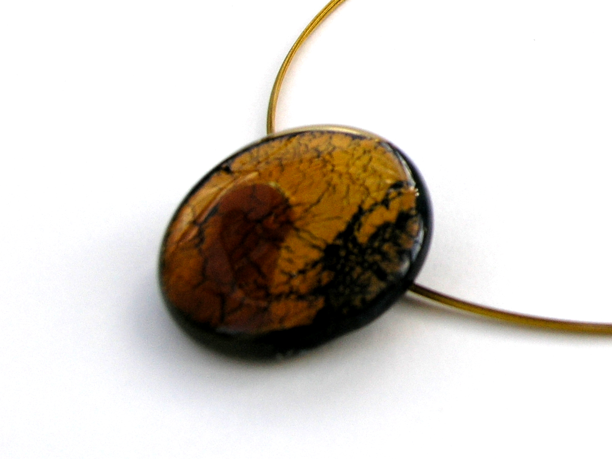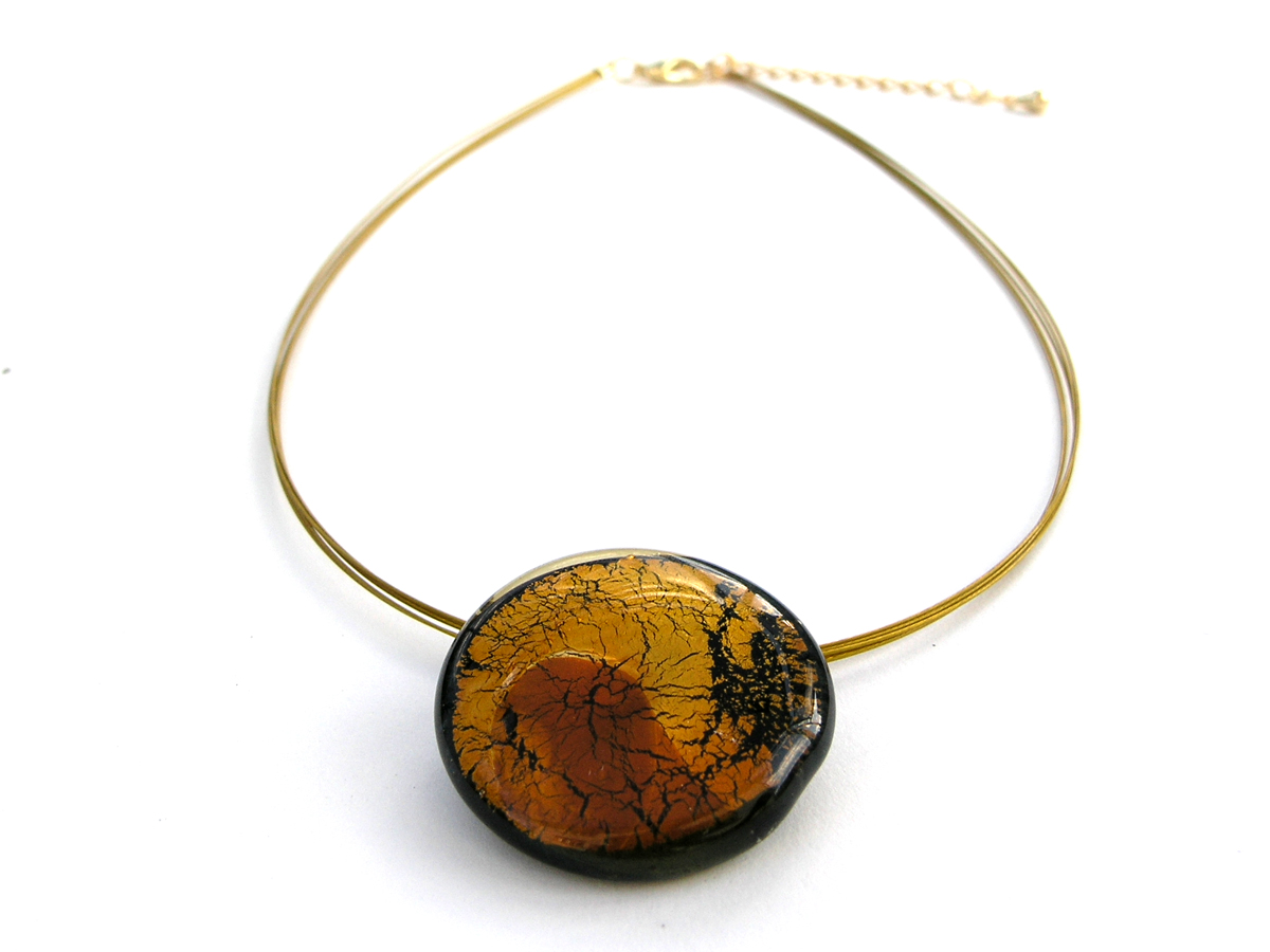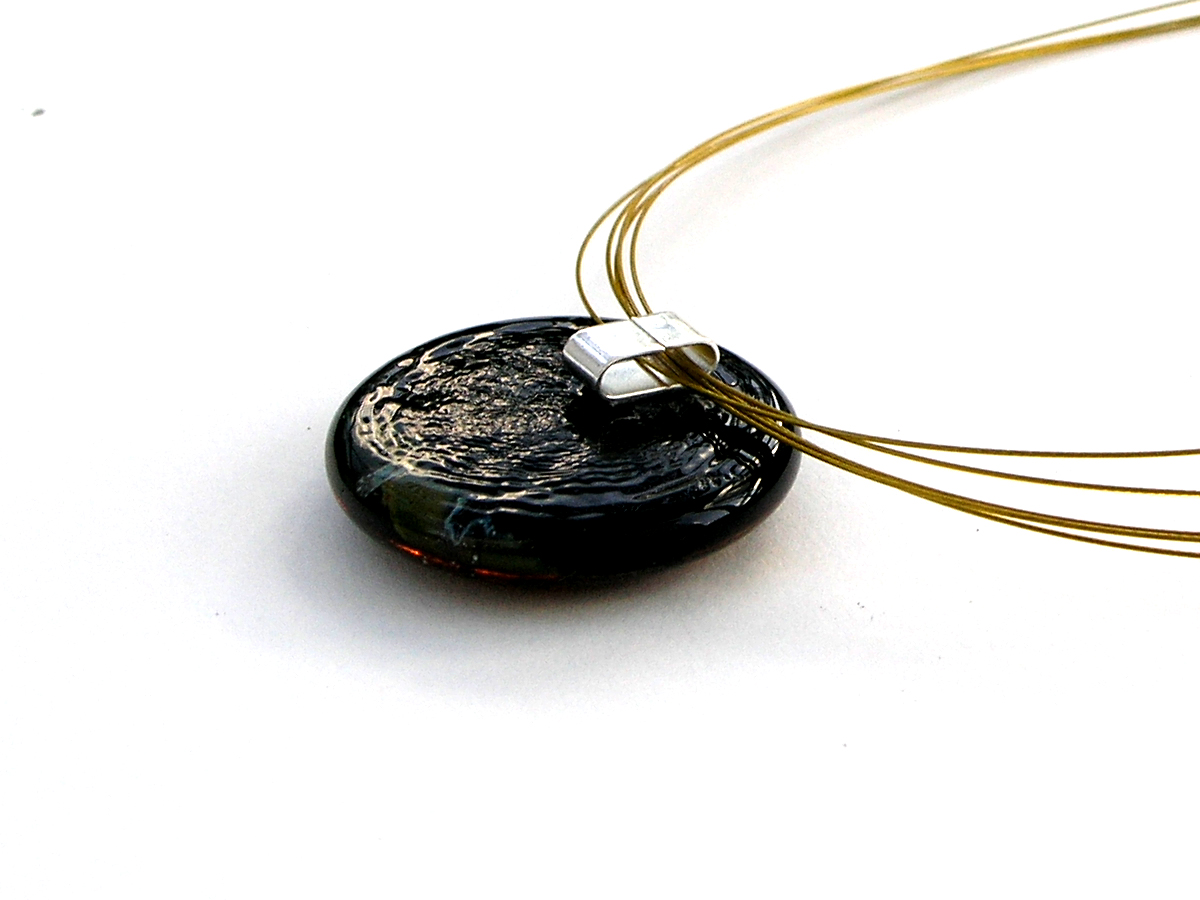 Die Formgebung der Glaselemente entsteht in freier Gestaltung vor dem Glasbrenner. Rainer Schrade, Glaskünstler der Galerie Glaswerk verwendet zur Herstellung farbige Murano Glasstäbe die mit Blattsilber, Blattgold und Aventurin unter hohen Temperaturen zu diesem Modeschmuck Unikat geformt werden. Das Schmuckstück dieser Halskette hat einen Durchmesser von ca. 3 cm und wiegt ca. 15g. Der Anhänger ist auf schwarzer Grundfläche mit Farbglas verarbeitet.