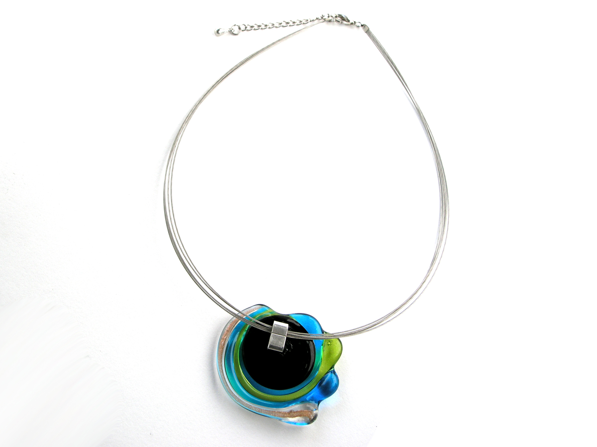 Das Schmuckstück dieser Halskette hat einen Durchmesser von ca. 3 cm und wiegt ca. 15g. Der Anhänger ist auf schwarzer Grundfläche mit Farbglas verarbeitet. Das farbig- transparente Glas in den Farben peridot türkis sorgt für einen schillernden Glanzeffekt.