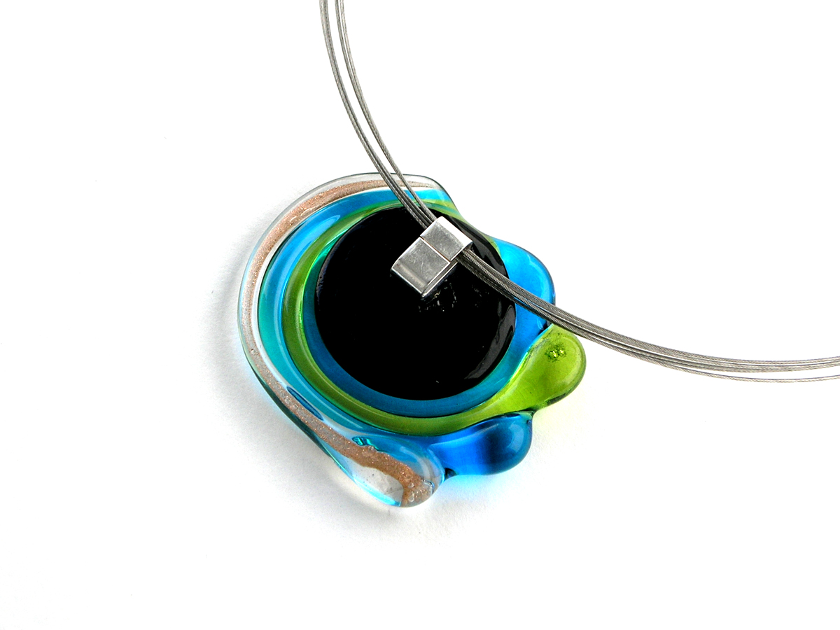 Rainer Schrade, Glaskünstler der Galerie Glaswerk, verwendet zur Herstellung farbige Murano Glasstäbe die mit Blattsilber, Blattgold und Aventurin unter hohen Temperaturen zu diesem Modeschmuck Unikat geformt werden.