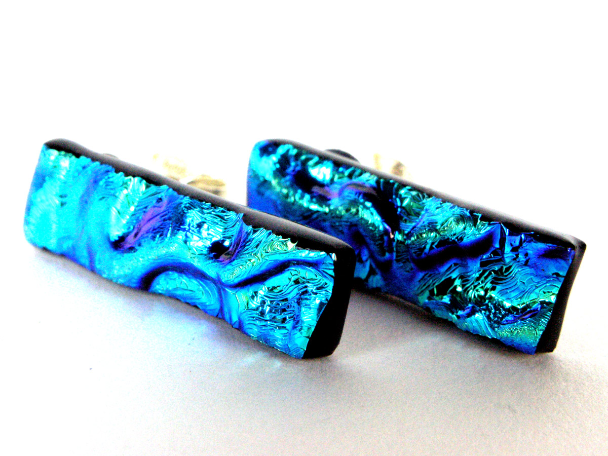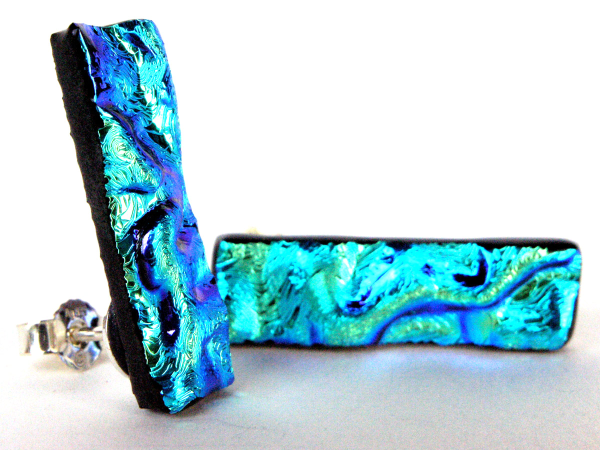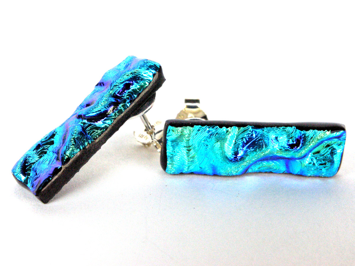 Für die Glasschmuck Serie Canyon verwendet die Kunsthandwerkerin Birgit Sänger von der Galerie Glaswerk kleine Glaselemente, die im Schmelzofen unter hohen Temperaturen zu diesen Modeschmuck Ohrsteckern geschmolzen werden. Die unebene Oberflächenstruktur der Serie Canyon leuchtet in dichromatischem Glanz.