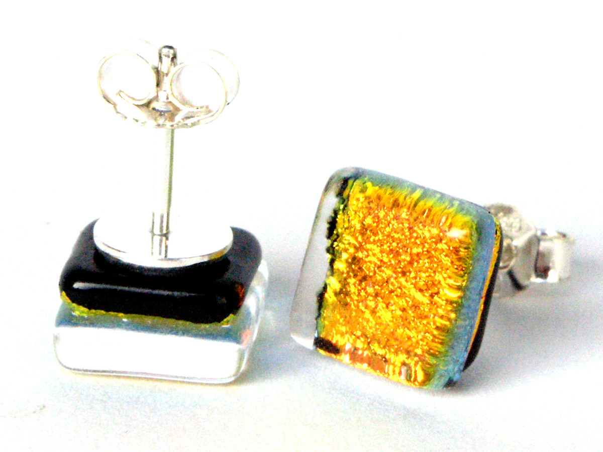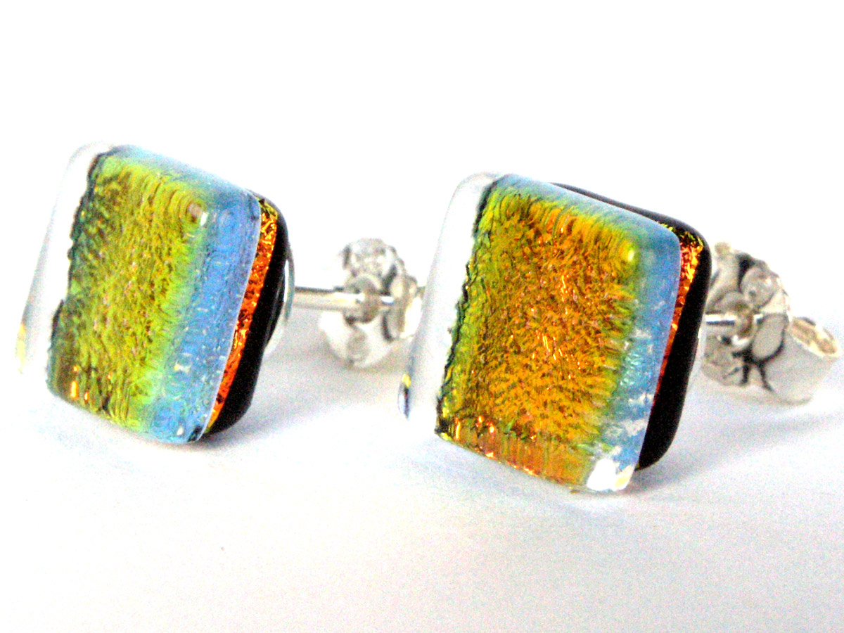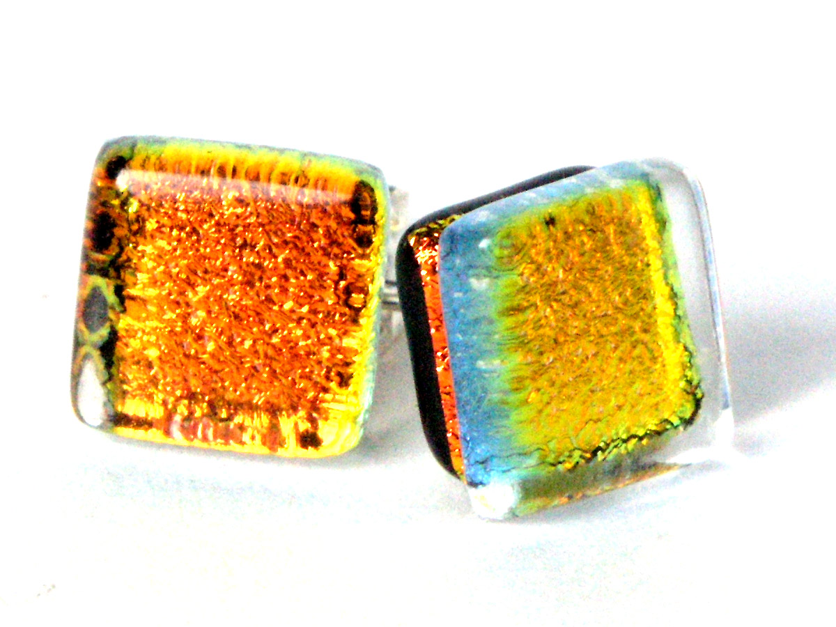 Diese Dichroic Ohrstecker haben einen Größe von ca. 1cm x 1cm und wiegen zusammen ca. 3g. Die Grundfarbe dieser Ohrstecker ist gold.