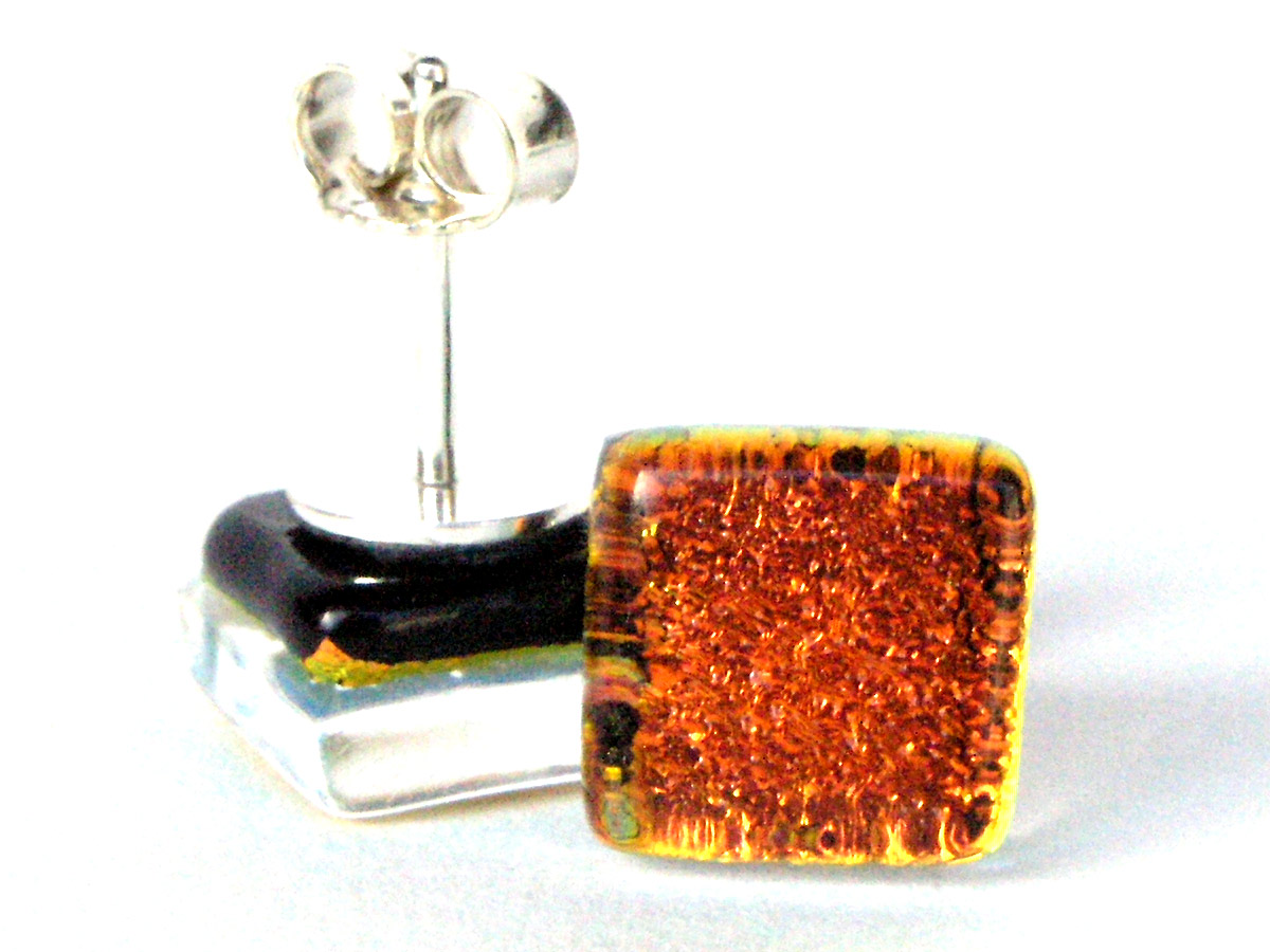 Für die Glasschmuck Serie Direct verwendet die Kunsthandwerkerin Birgit Sänger von der Galerie Glaswerk kleine Glaselemente, die im Schmelzofen unter hohen Temperaturen zu diesen Modeschmuck Ohrsteckern geschmolzen werden. In Kombination mit Klarglasschichten entsteht eine starke Tiefenwirkung und schöne Reflektionseffekte.
