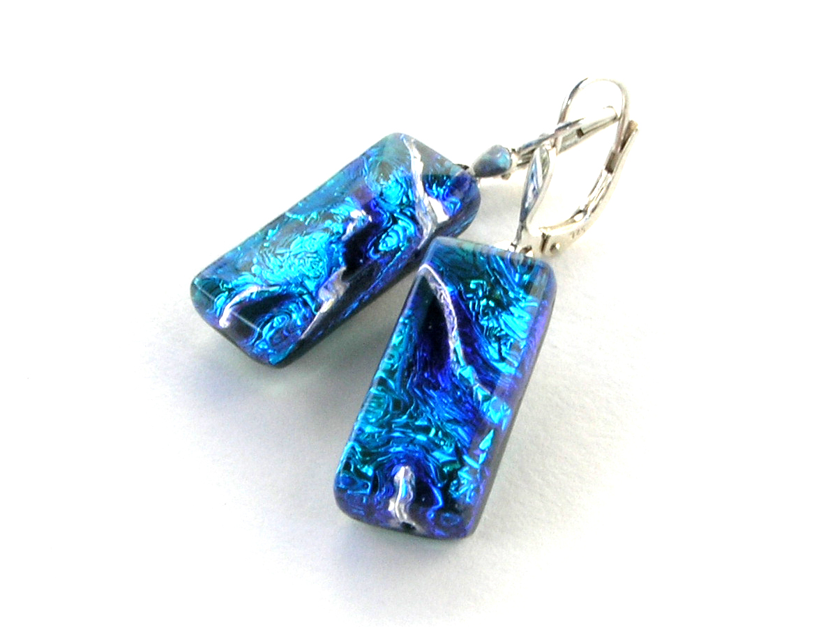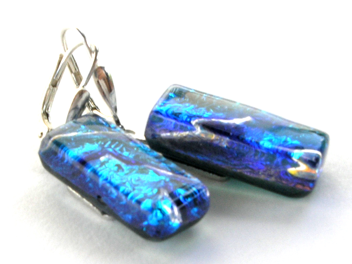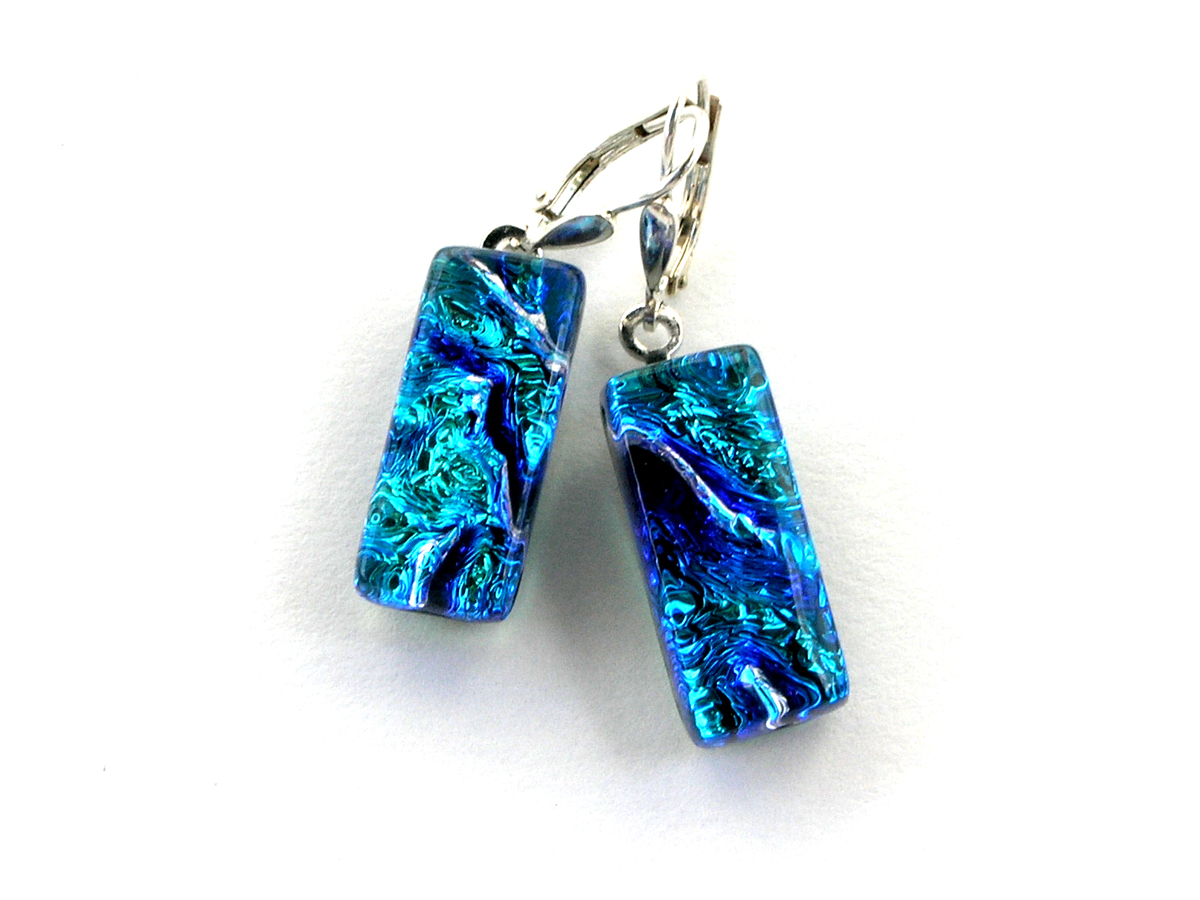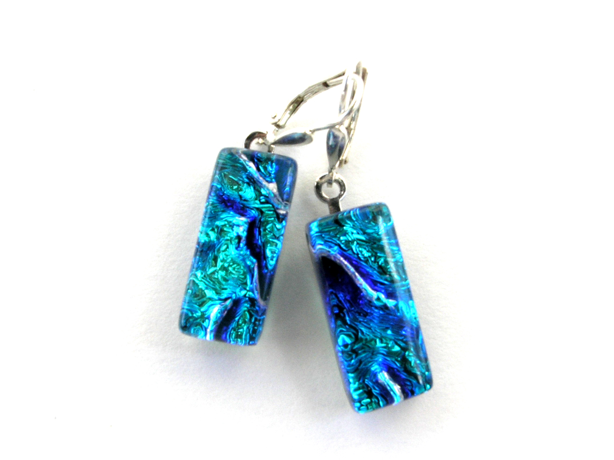 Diese Dichroic Ohrstecker haben einen Größe von ca. 2cm x 1cm und wiegen zusammen ca. 3g. Die Grundfarbe dieser Ohrstecker ist grünlich/türkis.