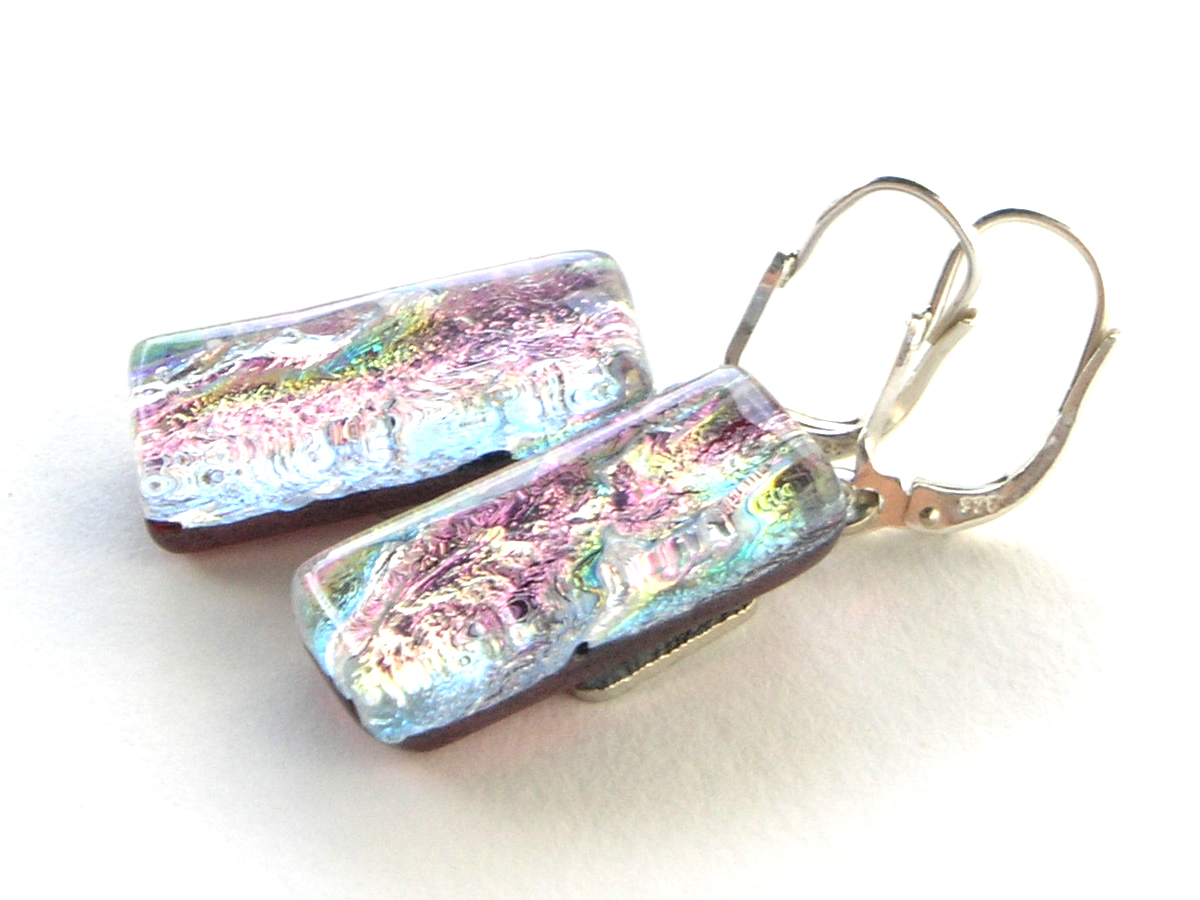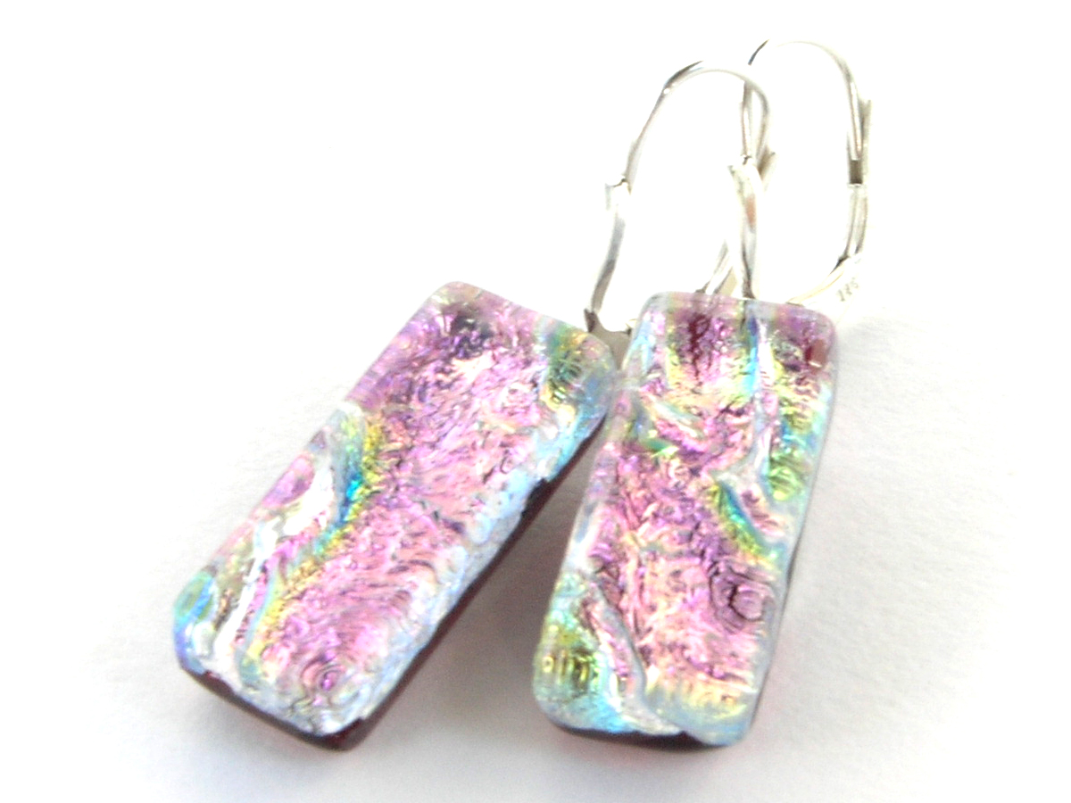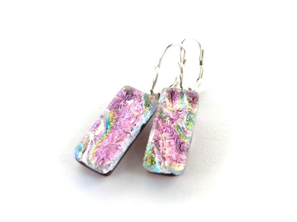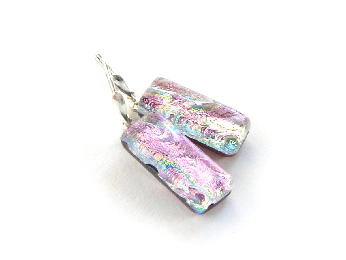 Diese Dichroic Ohrstecker haben einen Größe von ca. 2cm x 1cm und wiegen zusammen ca. 3g. Die Grundfarbe dieser Ohrstecker ist rosa.