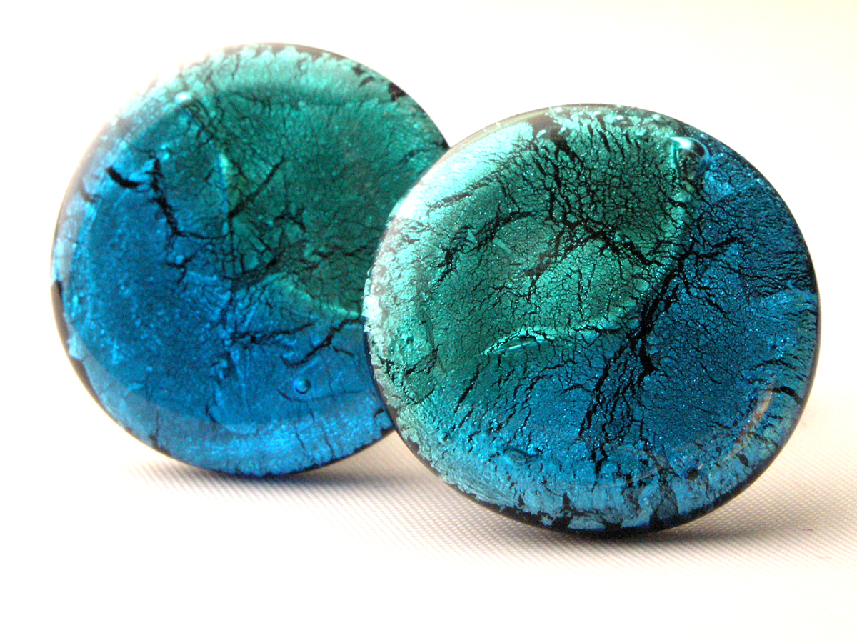 Die Glaselemente für Ohrclips der Midnight Serie werden frei und ohne Vorlage und Formen vor der Glasbläserlampe gestaltet. Mit einem Fußpedal reguliert der Glaskünstler die Intensität der Flamme seines Glasbrenners um verschiedene Festigkeiten des Materials in verschiedenen Techniken bearbeiten zu können. Glasstäbe und beigemischte Materialien wie Blattgold, Blattsilber und Aventurin formt er in diesen hohen Temperaturen zu einzigartigen Schmuck Unikaten. In langen Abkühlungsphasen wird die Struktur des Glases anschließend im Kühlofen "entspannt" und in einem sanften Abkühlungsprozess gehärtet. Da es sich bei den Midnight Schmuckstücken um massives Glas handelt, sind die Glassteine schon von sich aus sehr viel stabiler als ein hohles Glasobjekt es jemals sein könnte. Nach dem Auskühlen werden die Elemente nachgearbeitet. Auf einer mit Industriediamanten beschichteten Schleifscheibe wird die Unterseite der Glassteine von Unebenheiten bereinigt und poliert. Nun können die Glaselemente mit allergieverträglichen Schmuckmonturen veredelt werden und es entstehen einzigartige Modeschmuck Unikate aus Glas.