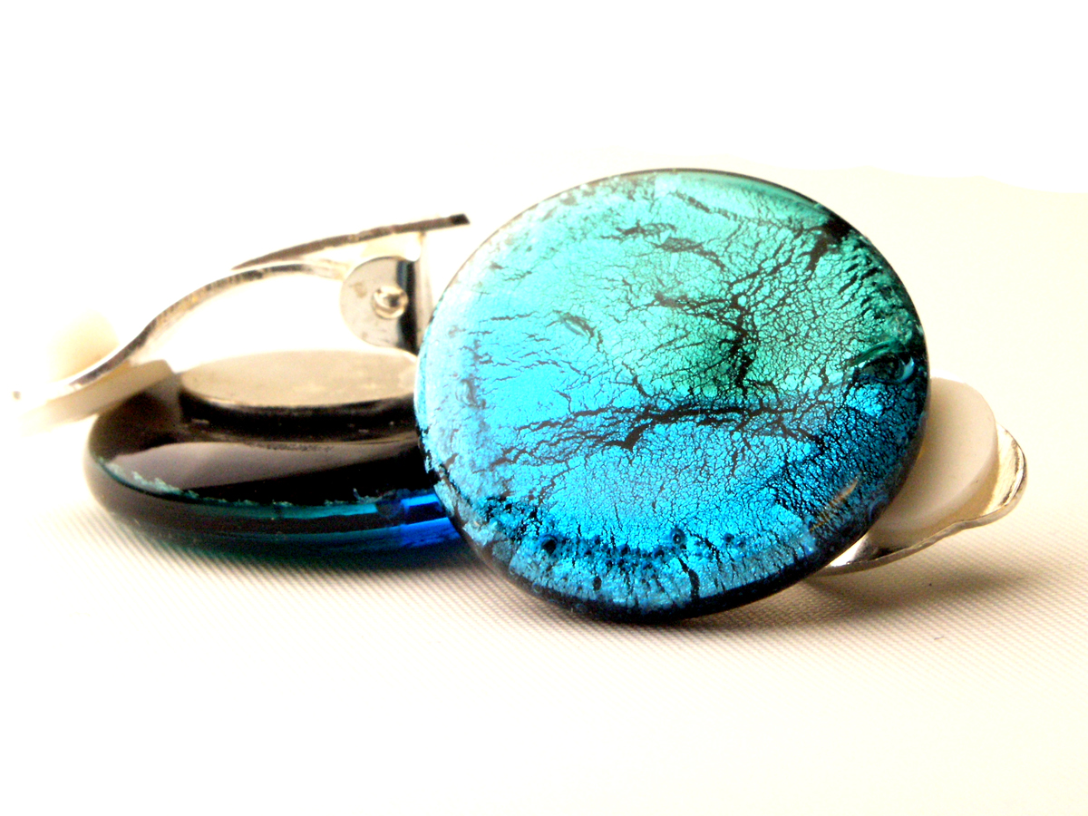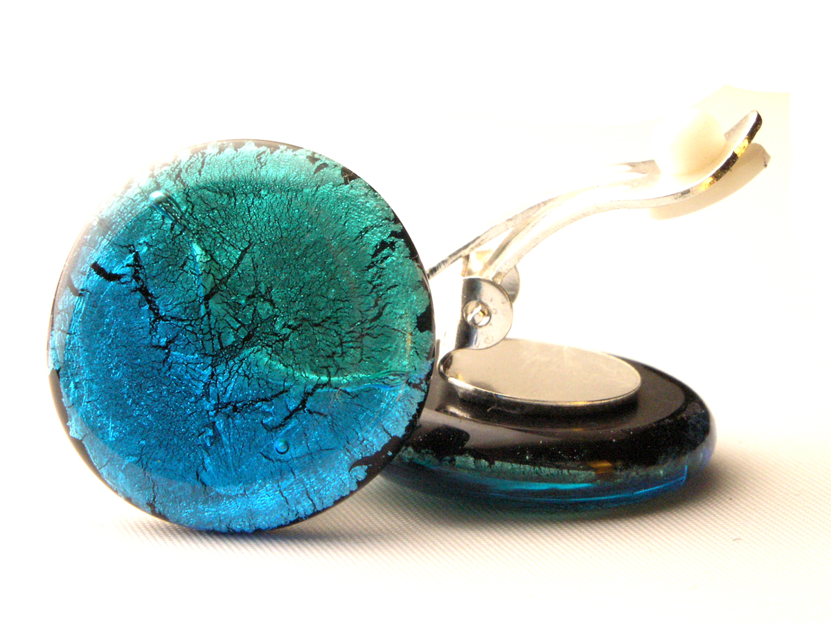 Das farbig- transparente Glas in den Farben aqua türkis sorgt für einen schillernden Glanzeffekt. Jedes Schmuckstück durchläuft während der Produktion mehrere Qualitätskontrollen und Sie können sicher sein, dass Sie ein einmalig gefertigtes, hochwertiges Stück Glasschmuck bekommen. Vor der Verarbeitung als Modeschmuck Ohrclip wird jede Unterseite mit der Diamantschleifmaschine überarbeitet und Unebenheiten werden begradigt. Die Monturen dieser Ohrclips sind aus Tombak. Der sichere Schnappverschluss und das zusätzliche Gummipolster sorgen für einen hohen und sicheren Tragekomfort am Ohr. Der verwendete Kleber hält 60kg / mm² , ist wasserfest und sogar seifenwasserbeständig. Nach einer letzten Qualitätskontrolle wird der Ohrschmuck geputzt und in einem gepolsterten Schmuck Etui sicher verpackt.