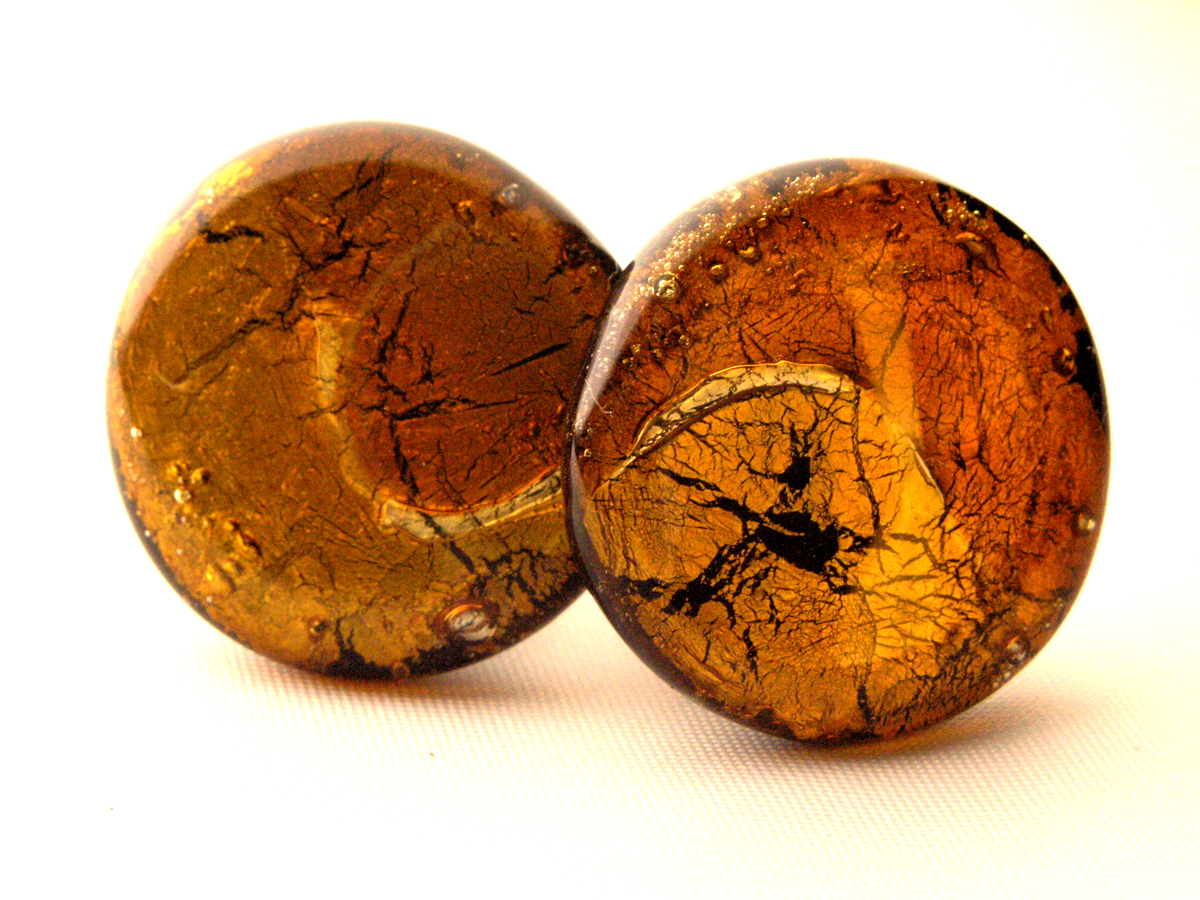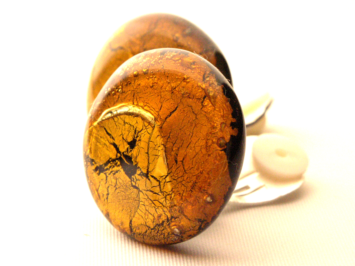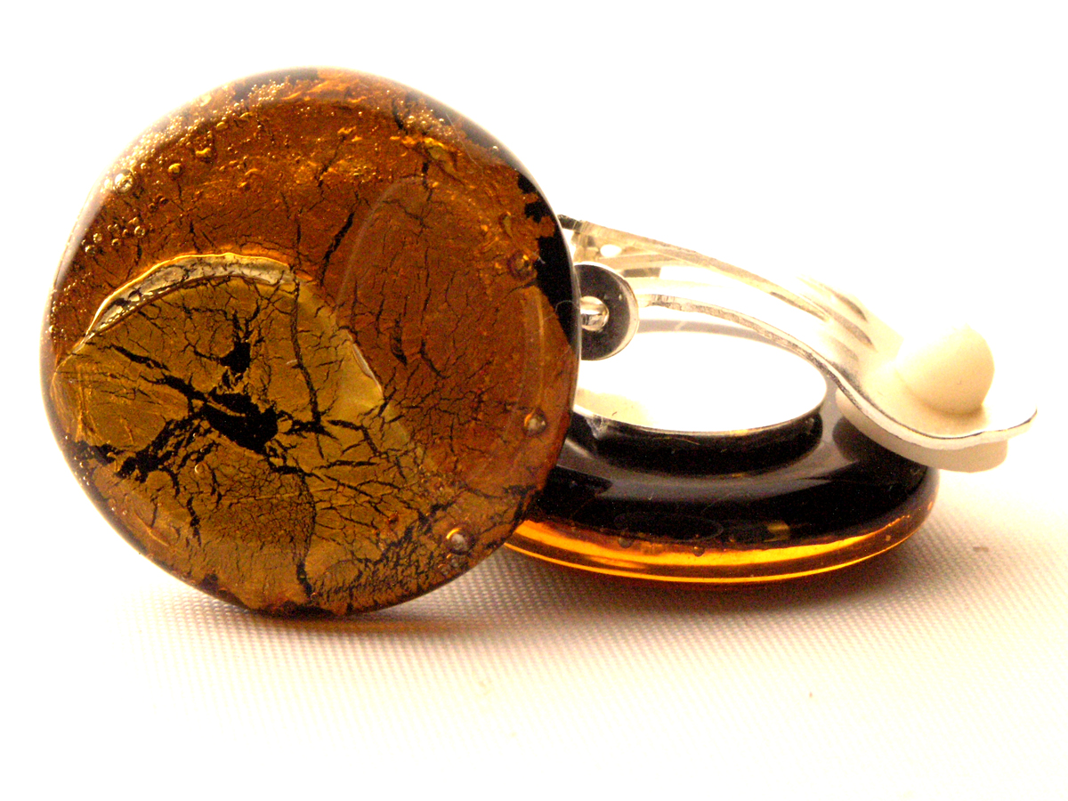 Das farbig- transparente Glas in der Farbe gold sorgt für einen schillernden Glanzeffekt. Jedes Schmuckstück durchläuft während der Produktion mehrere Qualitätskontrollen und Sie können sicher sein, dass Sie ein einmalig gefertigtes, hochwertiges Stück Glasschmuck bekommen. Vor der Verarbeitung als Modeschmuck Ohrclip wird jede Unterseite mit der Diamantschleifmaschine überarbeitet und Unebenheiten werden begradigt. Die Monturen dieser Ohrclips sind aus Tombak. Der sichere Schnappverschluss und das zusätzliche Gummipolster sorgen für einen hohen und sicheren Tragekomfort am Ohr. Der verwendete Kleber hält 60kg / mm² , ist wasserfest und sogar seifenwasserbeständig. Nach einer letzten Qualitätskontrolle wird der Ohrschmuck geputzt und in einem gepolsterten Schmuck Etui sicher verpackt.