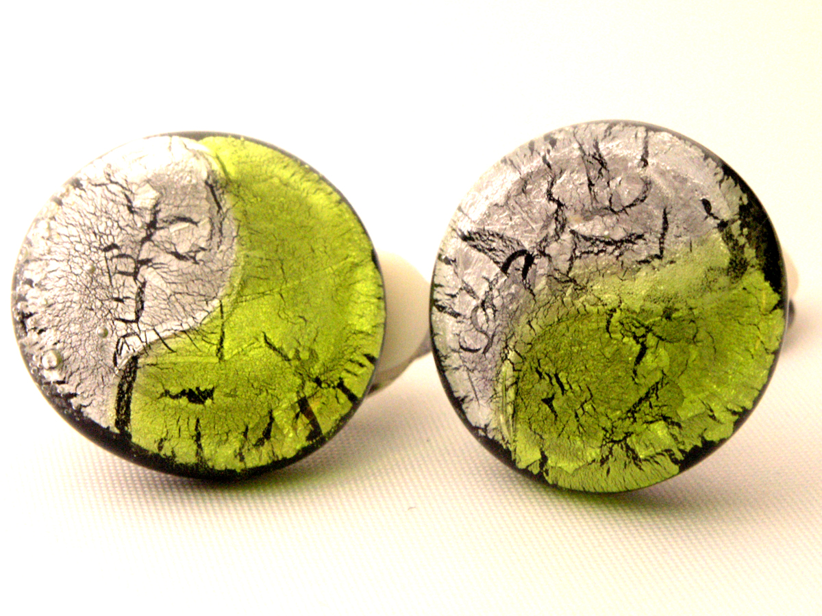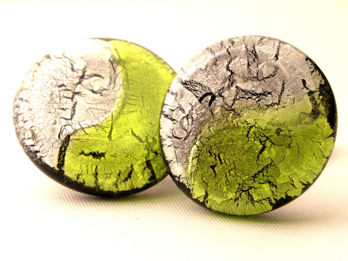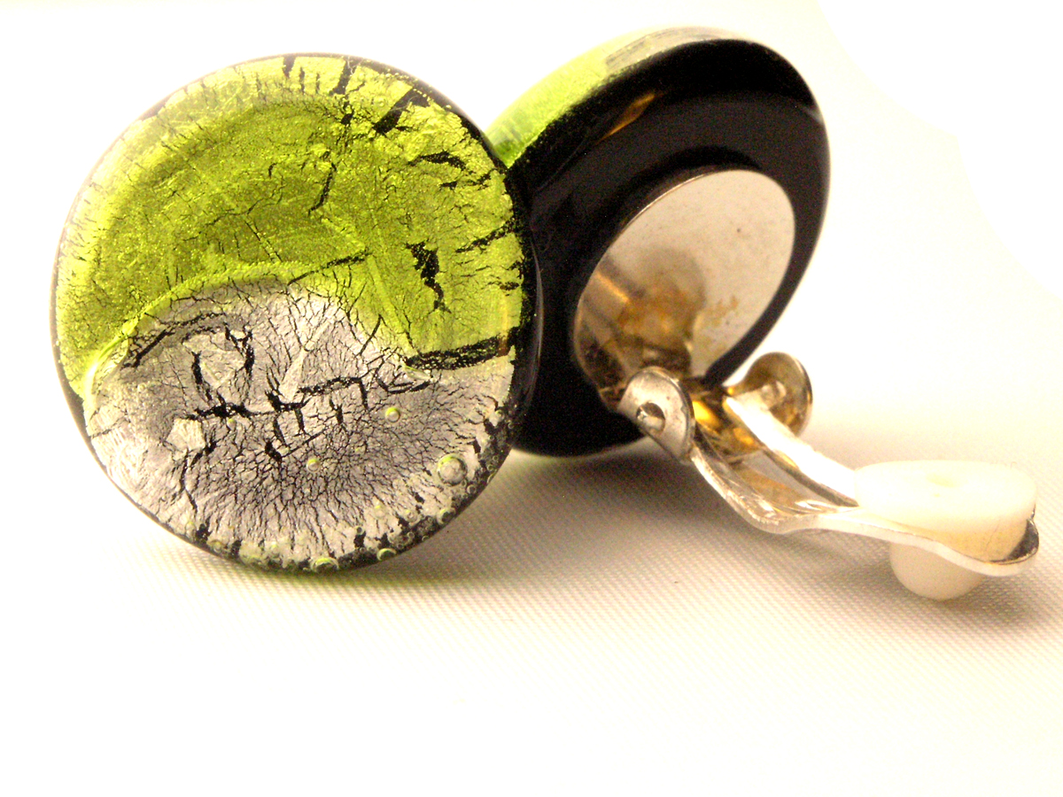 Das farbig- transparente Glas in den Farben peridot silber sorgt für einen schillernden Glanzeffekt. Jedes Schmuckstück durchläuft während der Produktion mehrere Qualitätskontrollen und Sie können sicher sein, dass Sie ein einmalig gefertigtes, hochwertiges Stück Glasschmuck bekommen. Vor der Verarbeitung als Modeschmuck Ohrclip wird jede Unterseite mit der Diamantschleifmaschine überarbeitet und Unebenheiten werden begradigt. Die Monturen dieser Ohrclips sind aus Tombak. Der sichere Schnappverschluss und das zusätzliche Gummipolster sorgen für einen hohen und sicheren Tragekomfort am Ohr. Der verwendete Kleber hält 60kg / mm² , ist wasserfest und sogar seifenwasserbeständig. Nach einer letzten Qualitätskontrolle wird der Ohrschmuck geputzt und in einem gepolsterten Schmuck Etui sicher verpackt.