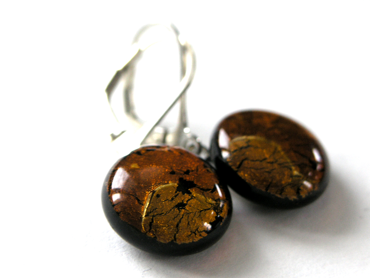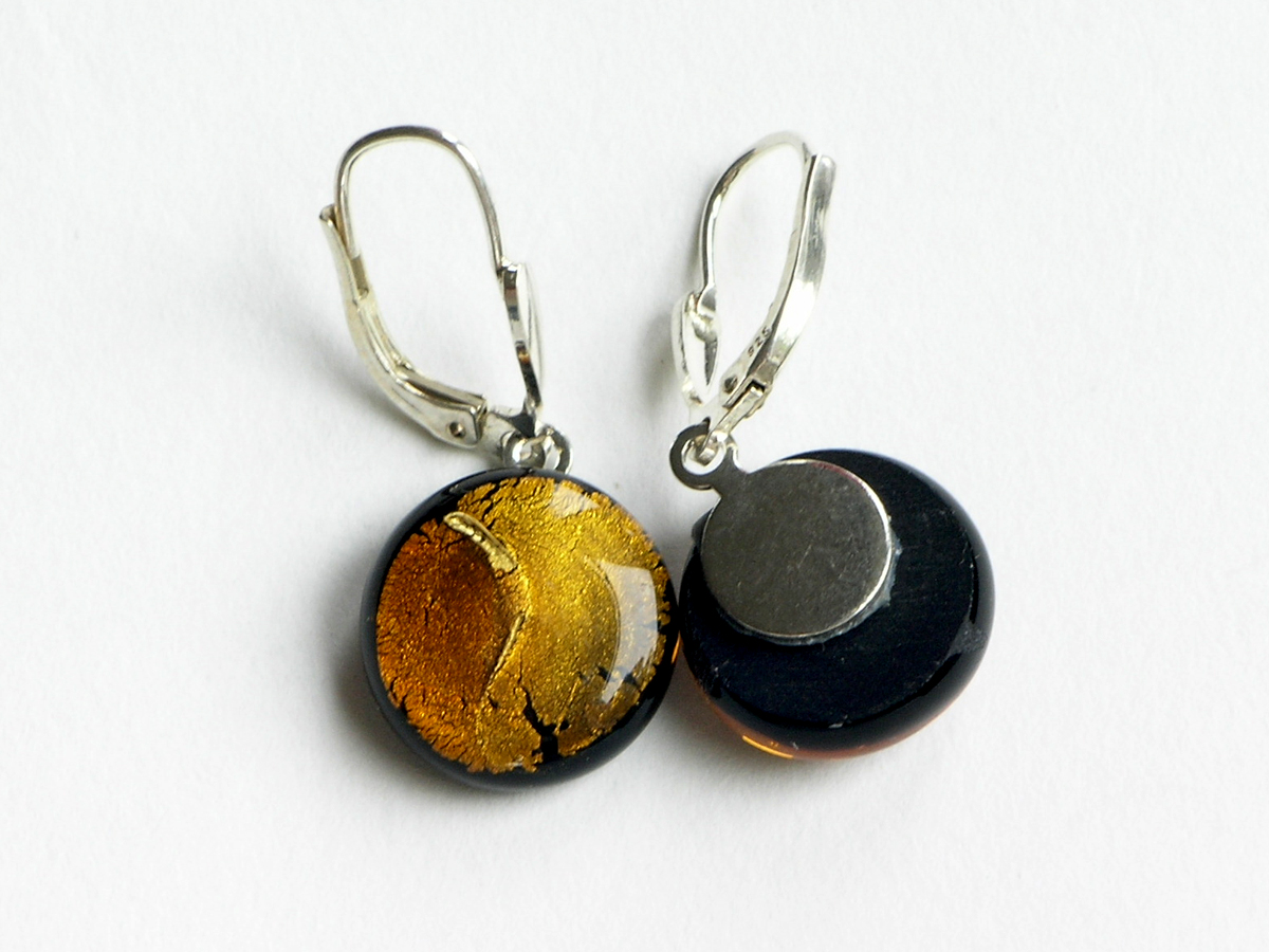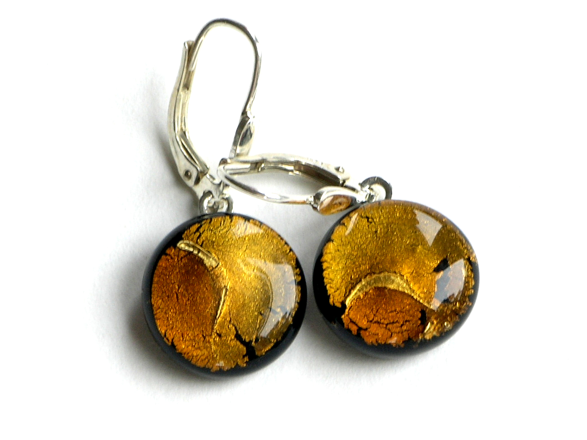 Die Formgebung der Ohrschmuck Glaselemente entsteht in freier Gestaltung vor dem Glasbrenner. Rainer Schrade, Glaskünstler der Galerie Glaswerk, verwendet zur Herstellung farbige Murano Glasstäbe, die mit Blattsilber, Blattgold und Aventurin unter hohen Temperaturen zu diesen Modeschmuck Unikaten geformt werden. Die Schmuckstücke dieser Ohrhänger haben einen Durchmesser von ca. 1cm und wiegen zusammen mit 925 Sterlingsilber Montur ca. 3g. Die Schmucksteine dieser Ohrhänger sind ist auf schwarzer Grundfläche verarbeitet.