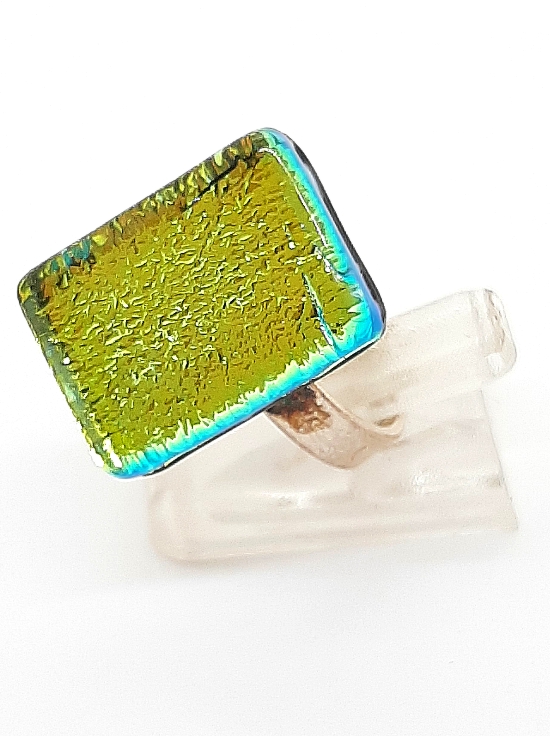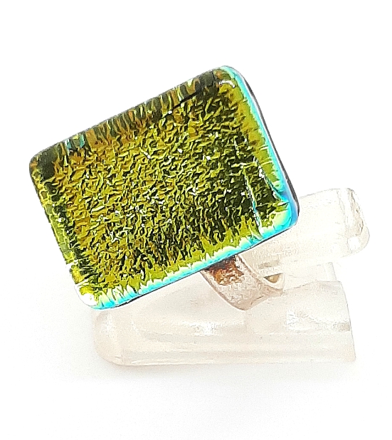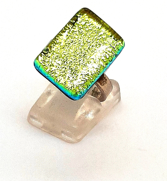 Für die Glasschmuck Serie Direct verwendet die Kunsthandwerkerin Birgit Sänger von der Galerie Glaswerk kleine Glaselemente, die im Schmelzofen unter hohen Temperaturen zu diesem Modeschmuck Fingerring geschmolzen werden. In Kombination mit Klarglasschichten entsteht eine starke Tiefenwirkung und schöne Reflektionseffekte.