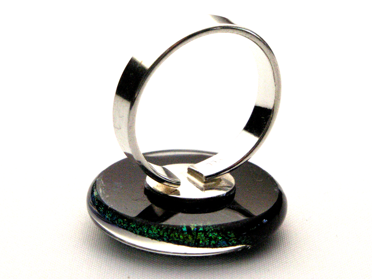Die Ringmontur ist aus 925 Sterlingsilber und in der Größe leicht verstellbar. Der Durchmesser dieser Ringe ist 17mm, wobei die Ringschiene unter dem Glaselement eine Öffnung hat um sie ca. (+) 1-2 mm in der Größe zu verändern. Diese Anpassung kann der Träger / die Trägerin vorsichtig selber vornehmen.
