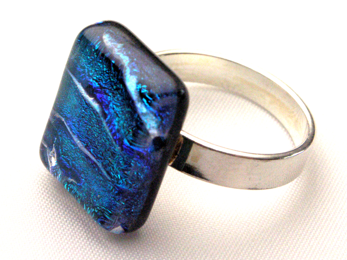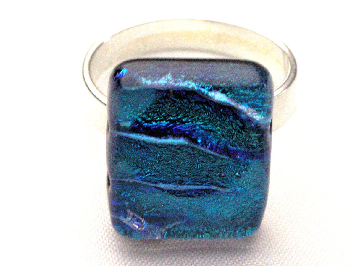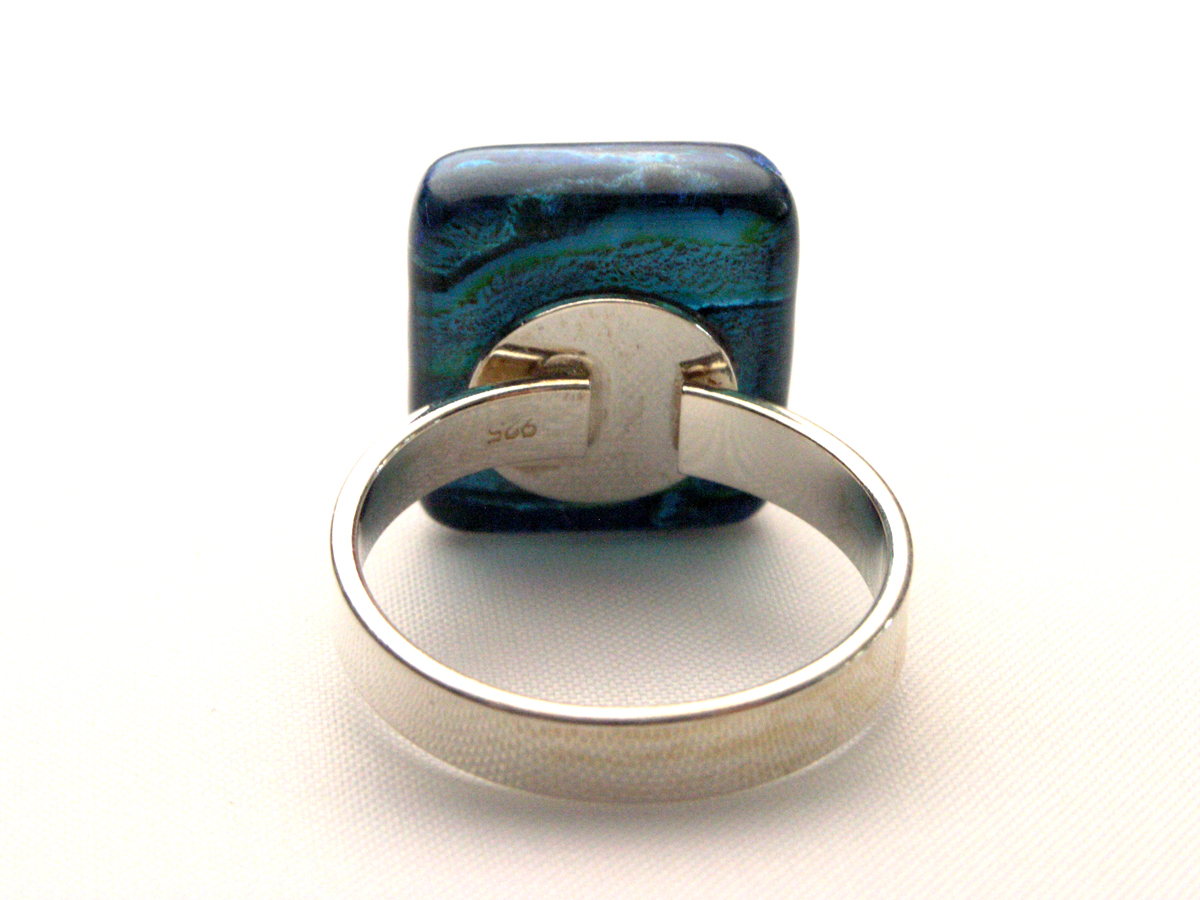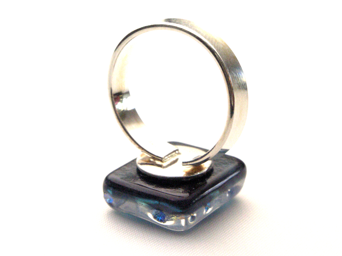 Für die Glasschmuck Serie Fog verwendet die Kunsthandwerkerin Birgit Sänger von der Galerie Glaswerk kleine Glaselemente, die im Schmelzofen unter hohen Temperaturen zu diesem Modeschmuck Fingerring geschmolzen werden. In Kombination mit Klarglasschichten entsteht eine starke Tiefenwirkung und schöne Reflektionseffekte.