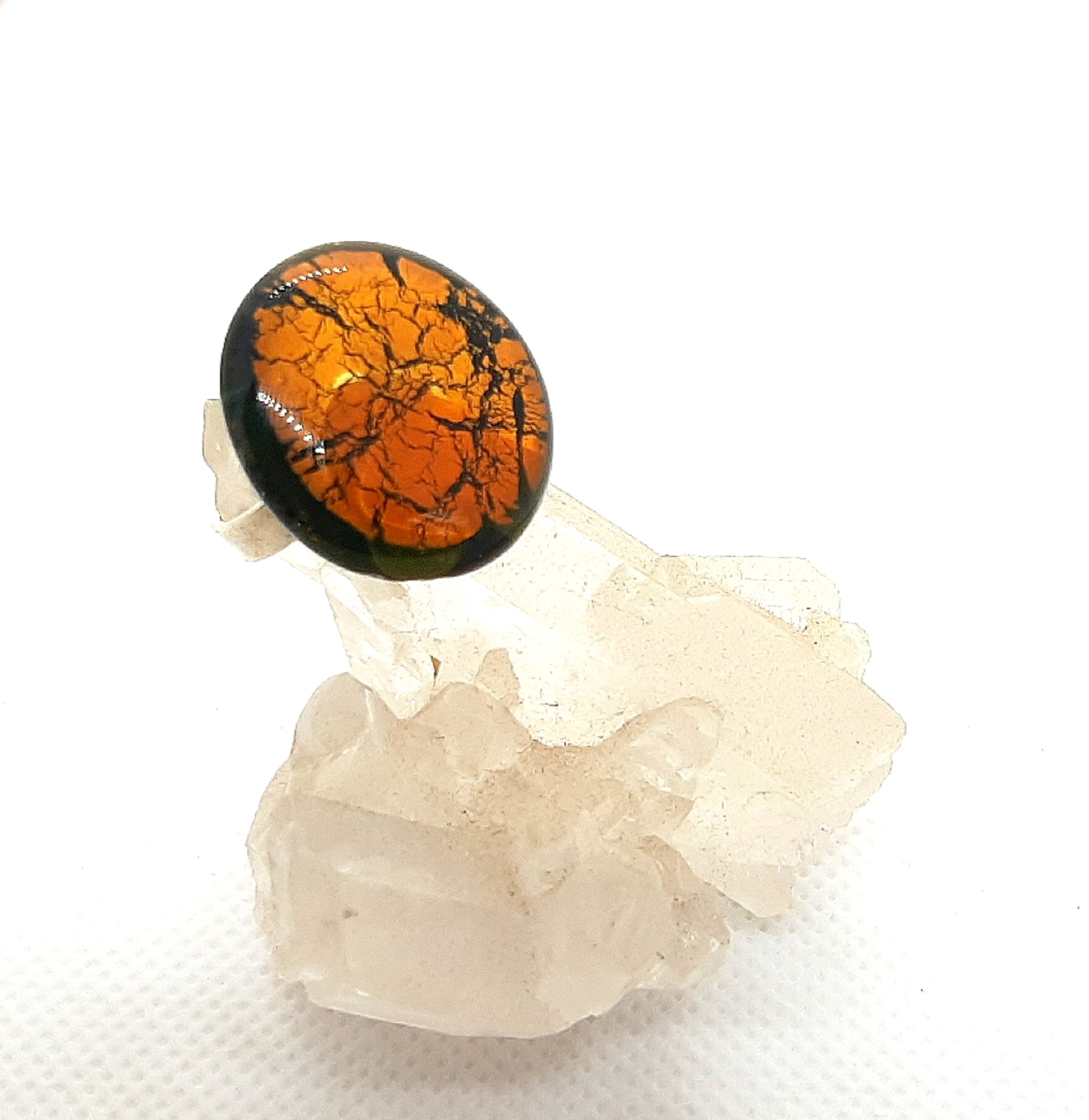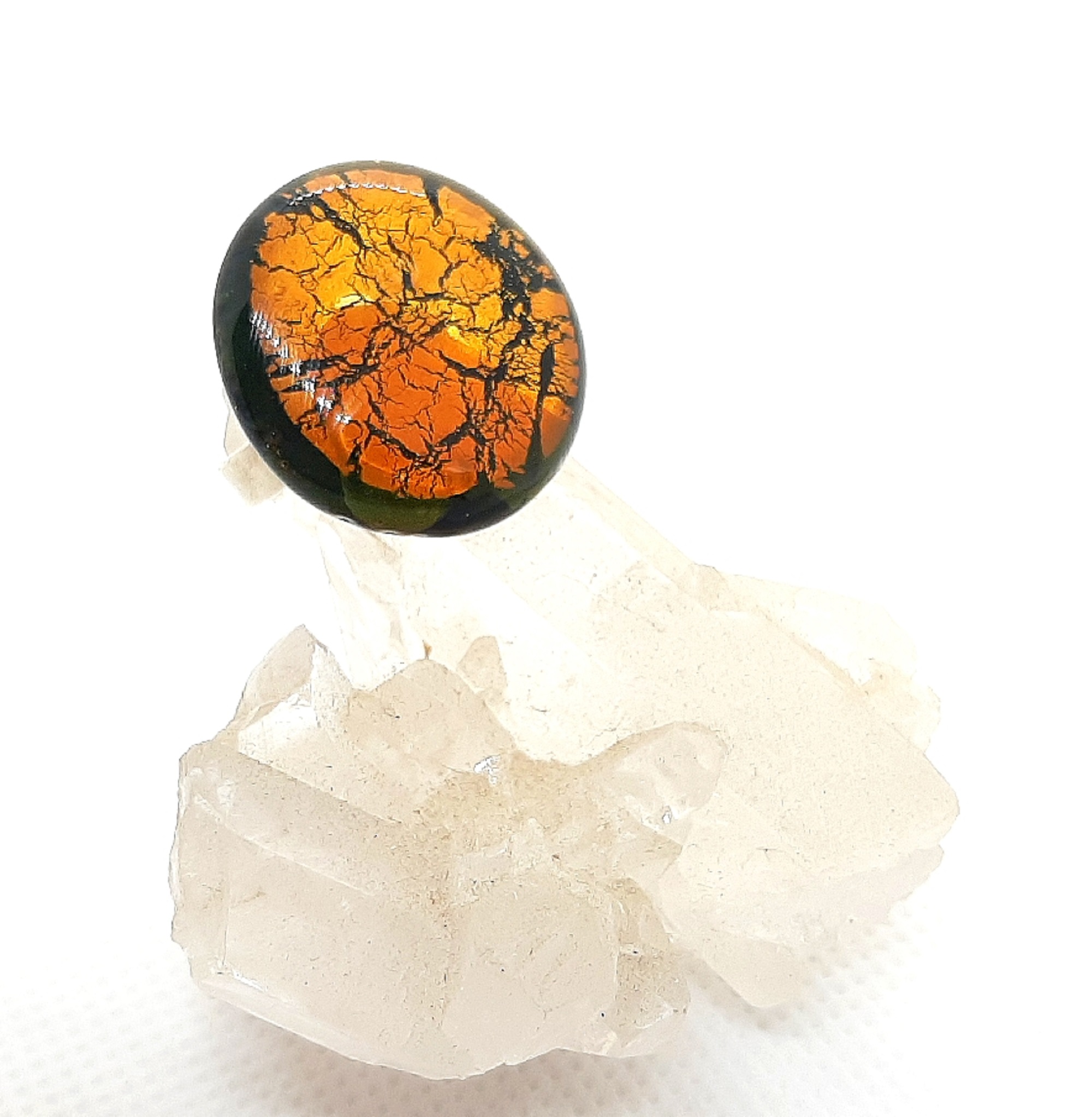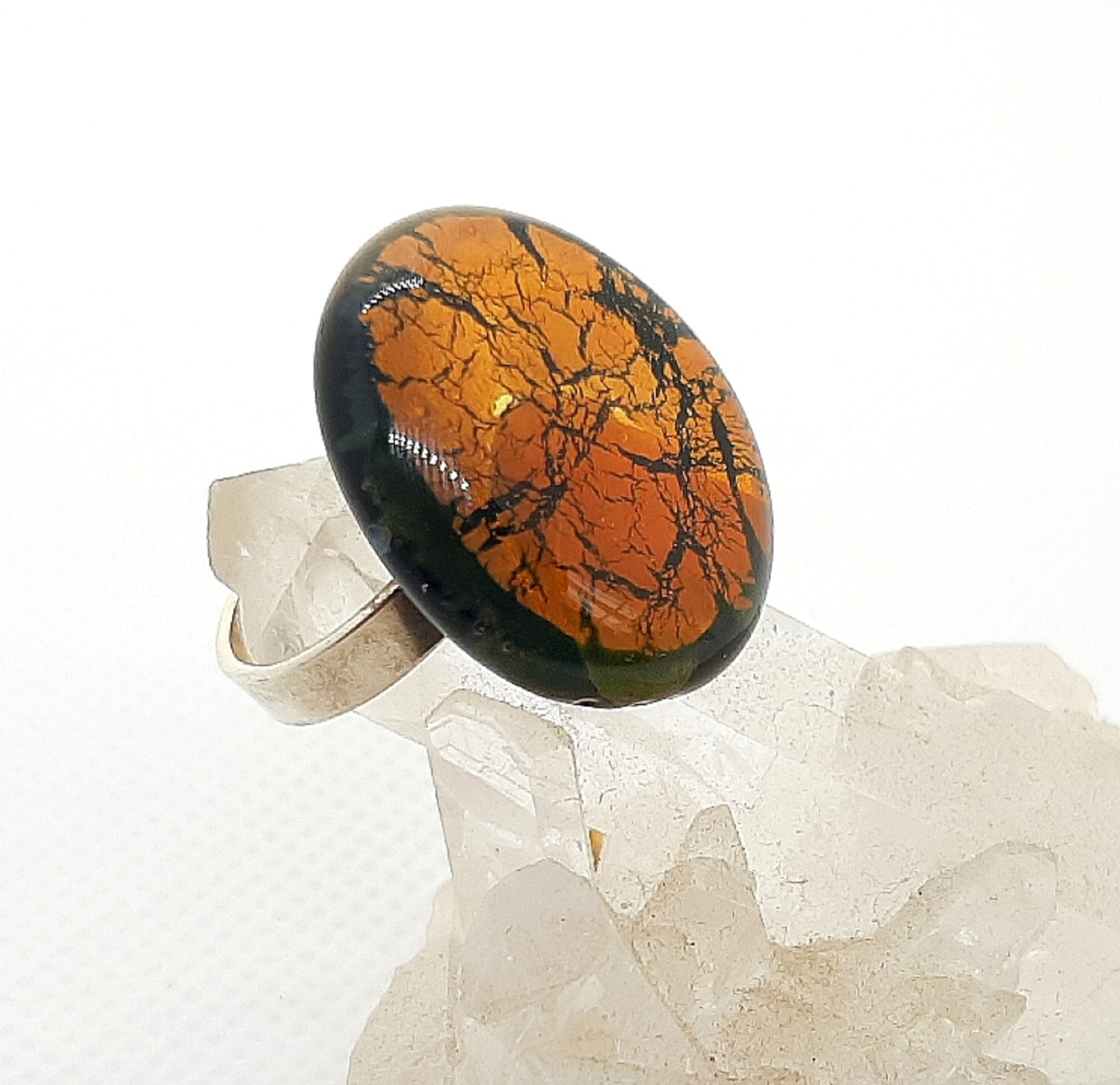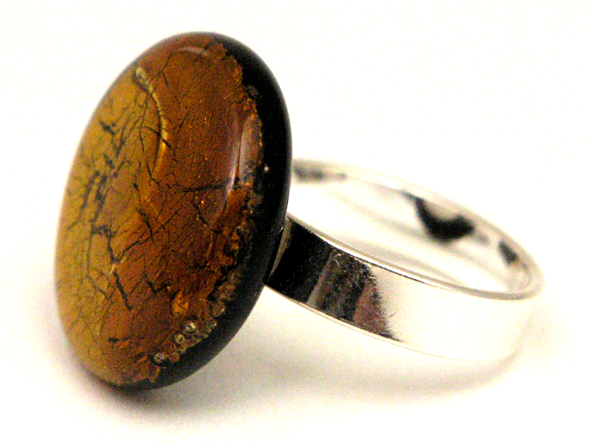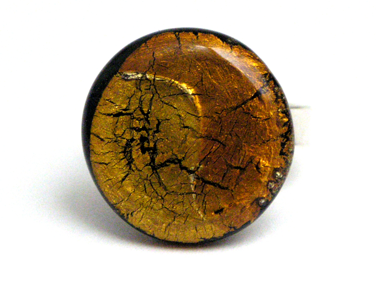 Das farbig- transparente Glas, in der Farbe gold sorgt für einen schillernden Glanzeffekt. Jedes Schmuckstück durchläuft in der Produktion mehrere Qualitätskontrollen und Sie können sicher sein, dass Sie ein einmalig gefertigtes, hochwertiges Stück Glasschmuck bekommen. Vor der Verarbeitung als Modeschmuck Fingerring wird jede Unterseite mit der Diamant Schleifmaschinen überarbeitet und Unebenheiten werden begradigt. Eine 925 Sterling Silber Ring Montur in der Größe 17mm (verstellbar) wird an der Unterseite befestigt. Der Verwendete Kleber hält 60kg / mm² , ist wasserfest und sogar seifenwasserbeständig. Nach einer letzten Qualitätskontrolle wird der Handschmuck geputzt und in einem gepolsterten Ring Etui sicher verpackt.