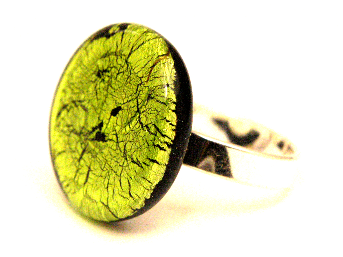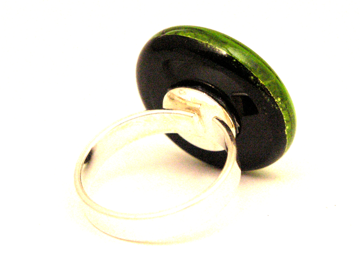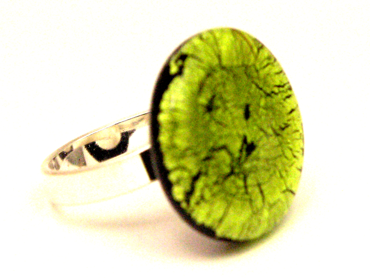 Das farbig- transparente Glas, in der Farbe peridot sorgt für einen schillernden Glanzeffekt. Jedes Schmuckstück durchläuft in der Produktion mehrere Qualitätskontrollen und Sie können sicher sein, dass Sie ein einmalig gefertigtes, hochwertiges Stück Glasschmuck bekommen. Vor der Verarbeitung als Modeschmuck Fingerring wird jede Unterseite mit der Diamant Schleifmaschinen überarbeitet und Unebenheiten werden begradigt. Eine 925 Sterling Silber Ring Montur in der Größe 17mm (verstellbar) wird an der Unterseite befestigt. Der Verwendete Kleber hält 60kg / mm² , ist wasserfest und sogar seifenwasserbeständig. Nach einer letzten Qualitätskontrolle wird der Handschmuck geputzt und in einem gepolsterten Ring Etui sicher verpackt.