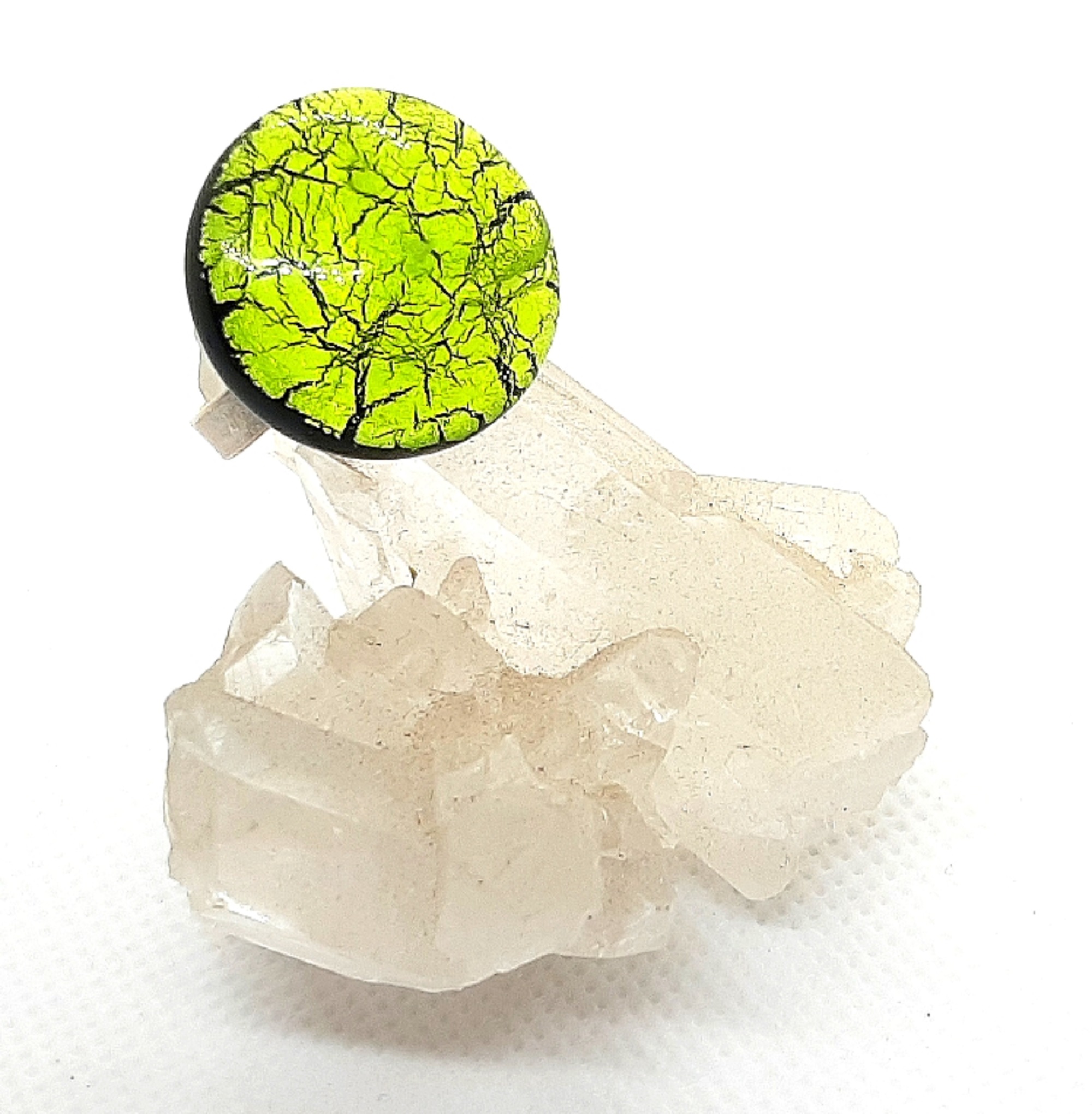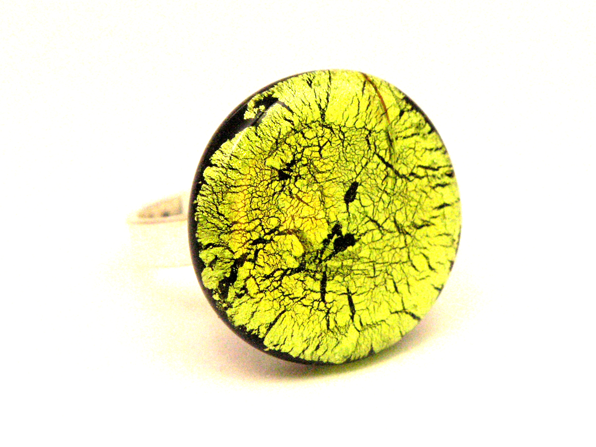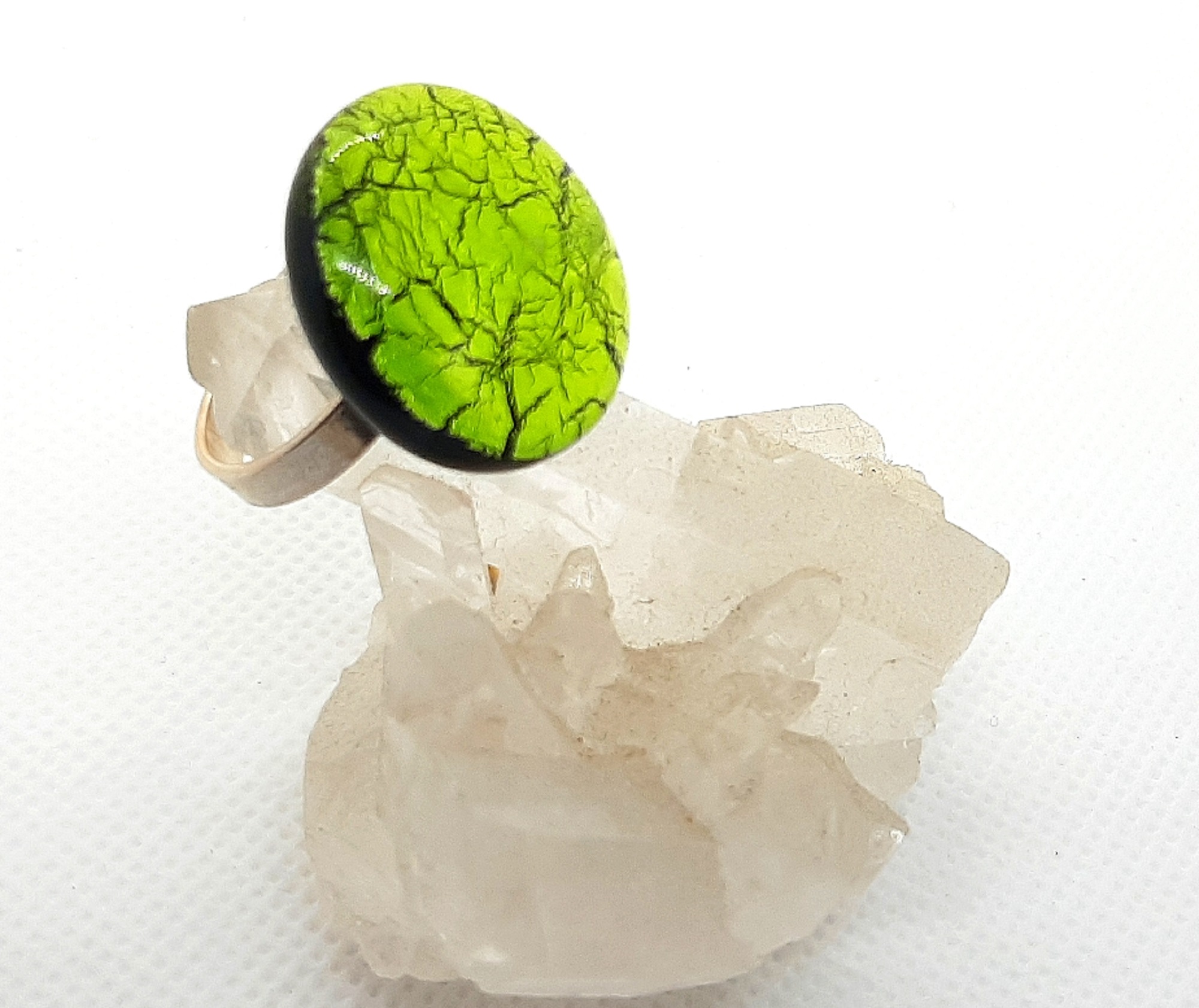 Das farbig- transparente Glas, in der Farbe peridot sorgt für einen schillernden Glanzeffekt. Jedes Schmuckstück durchläuft in der Produktion mehrere Qualitätskontrollen und Sie können sicher sein, dass Sie ein einmalig gefertigtes, hochwertiges Stück Glasschmuck bekommen. Vor der Verarbeitung als Modeschmuck Fingerring wird jede Unterseite mit der Diamant Schleifmaschinen überarbeitet und Unebenheiten werden begradigt. Eine 925 Sterling Silber Ring Montur in der Größe 17mm (verstellbar) wird an der Unterseite befestigt. Der Verwendete Kleber hält 60kg / mm² , ist wasserfest und sogar seifenwasserbeständig. Nach einer letzten Qualitätskontrolle wird der Handschmuck geputzt und in einem gepolsterten Ring Etui sicher verpackt.