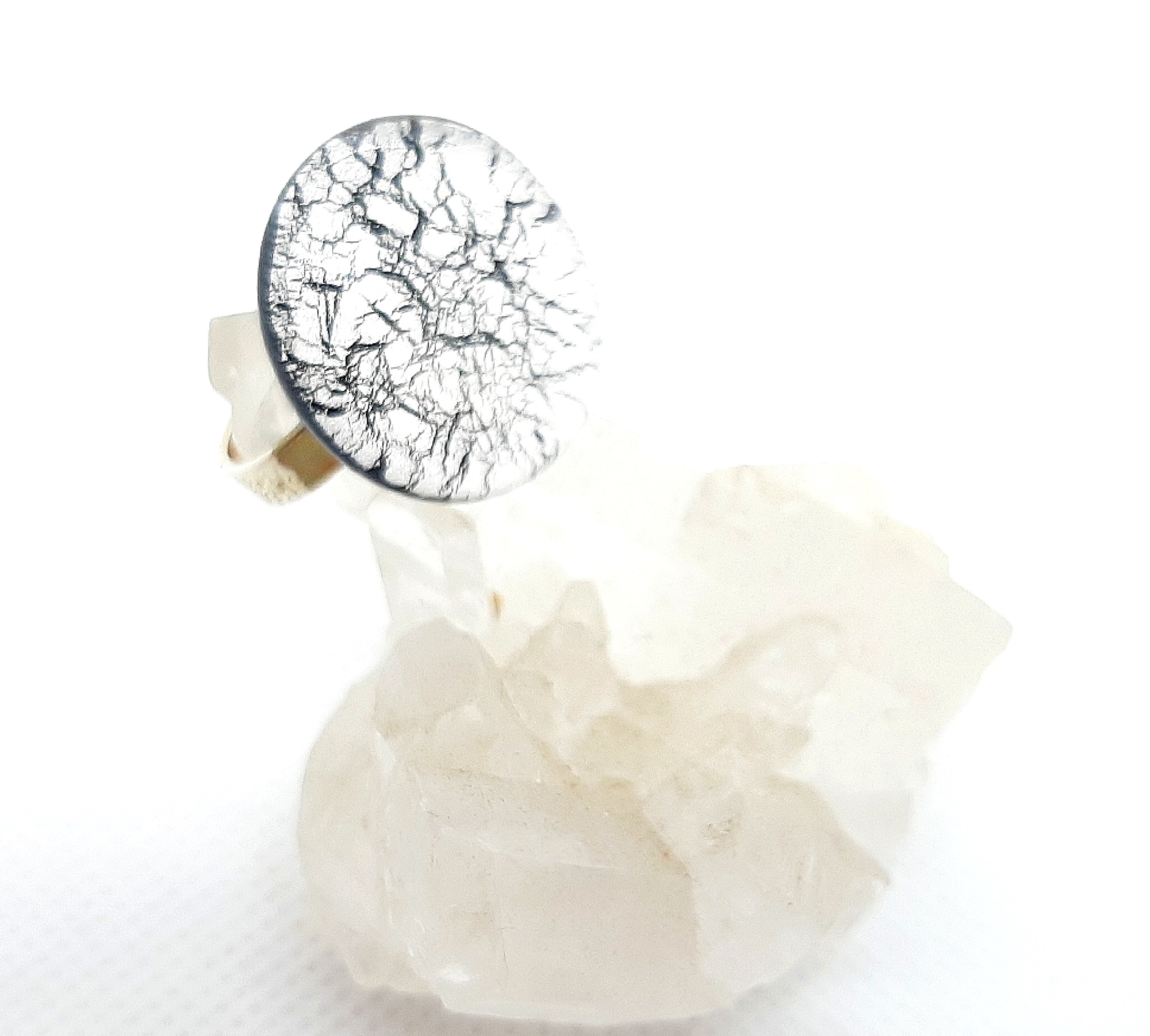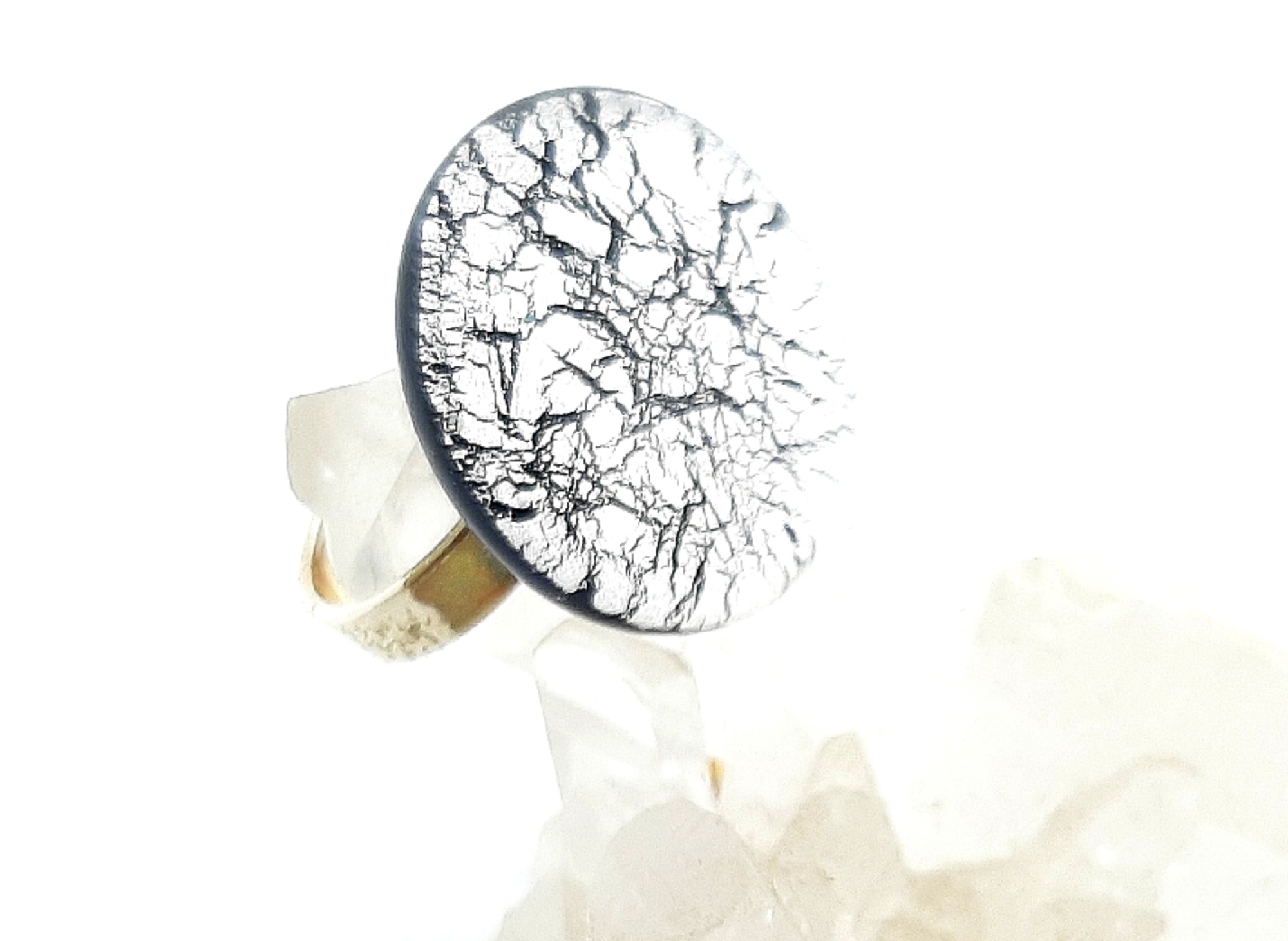 Das farbig- transparente Glas, in der Farbe silber sorgt für einen schillernden Glanzeffekt. Jedes Schmuckstück durchläuft in der Produktion mehrere Qualitätskontrollen und Sie können sicher sein, dass Sie ein einmalig gefertigtes, hochwertiges Stück Glasschmuck bekommen. Vor der Verarbeitung als Modeschmuck Fingerring wird jede Unterseite mit der Diamant Schleifmaschinen überarbeitet und Unebenheiten werden begradigt. Eine 925 Sterling Silber Ring Montur in der Größe 17mm (verstellbar) wird an der Unterseite befestigt. Der Verwendete Kleber hält 60kg / mm² , ist wasserfest und sogar seifenwasserbeständig. Nach einer letzten Qualitätskontrolle wird der Handschmuck geputzt und in einem gepolsterten Ring Etui sicher verpackt.