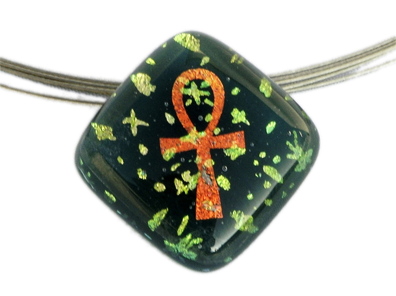 Diese Glasschmuck Halskette der Chakra Fashion Symbolschmuck Serie hat einen Anhänger aus Glas in der Größe von ca. 2cm x 2cm und wiegt ca. 10g. Die Grundfarbe dieses Anhängers ist grün und das Symbol leuchtet in dichromatischem Gold, es erscheint dem Betrachter visuell schwebend auf dem farbigen Untergrund. Die Anhängermontur aus versilbertem Tombak (Messinglegierung aus Kupfer und Zink, versilbert) ist sicher mit dem Glasstück verarbeitet.