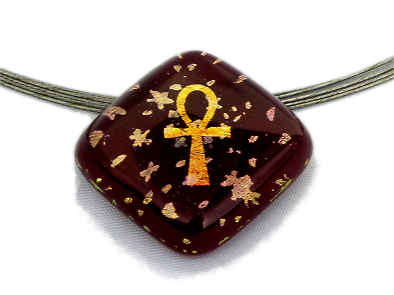 Diese Glasschmuck Halskette der Chakra Fashion Symbolschmuck Serie hat einen Anhänger aus Glas in der Größe von ca. 2cm x 2cm und wiegt ca. 10g. Die Grundfarbe dieses Anhängers ist rot und das Symbol leuchtet in dichromatischem Gold, es erscheint dem Betrachter visuell schwebend auf dem farbigen Untergrund. Die Anhängermontur aus versilbertem Tombak (Messinglegierung aus Kupfer und Zink, versilbert) ist sicher mit dem Glasstück verarbeitet.