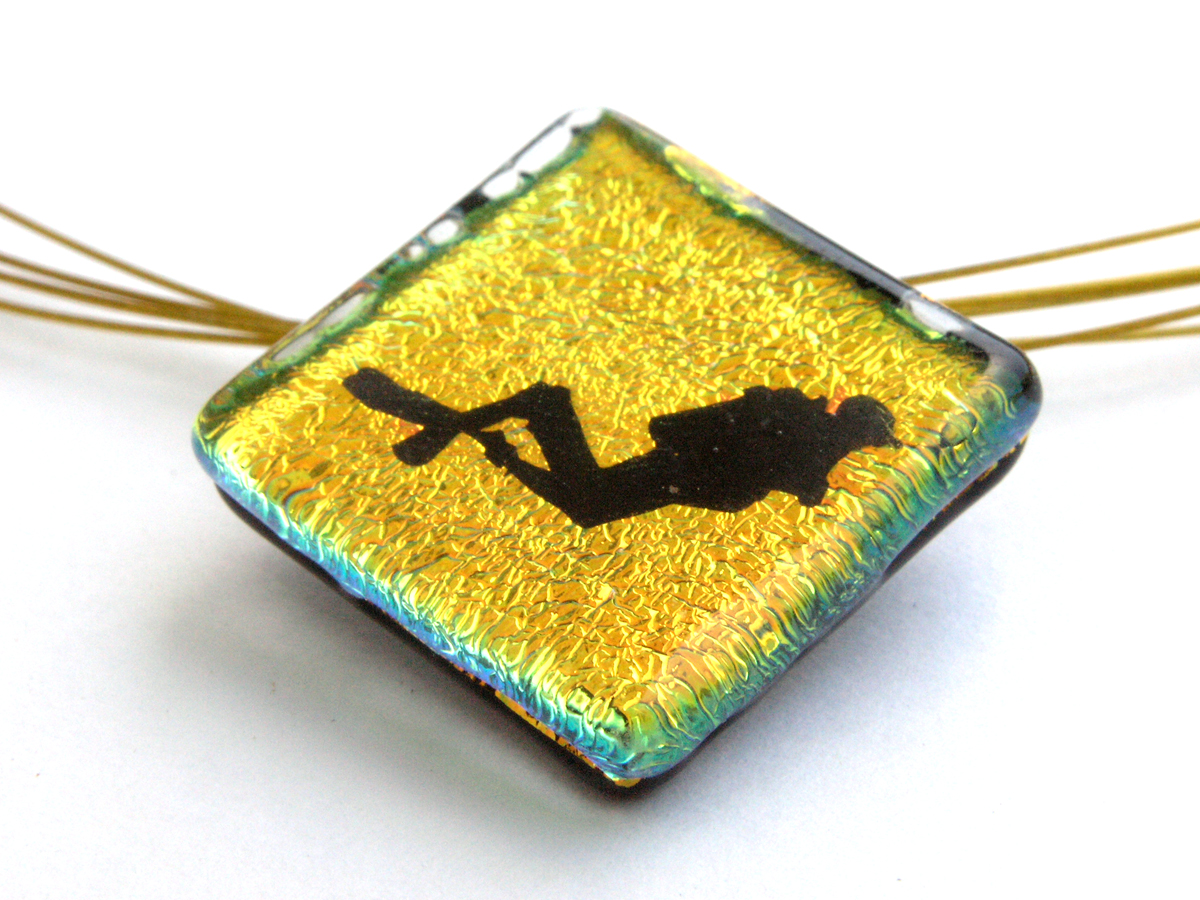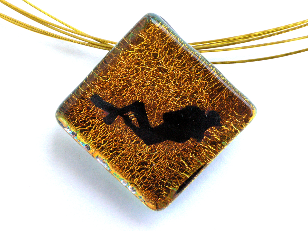 Für die Taucherschmuck Kettenanhänger der Serie Oceanic Shadow werden in zuvor aufwendiger Kleinarbeit hergestellte Fusingelemente mit transparentem Glas überzogen. Rainer Schrade, Glaskünstler (und selber begeistertet Taucher) der Galerie Glaswerk, fertigt diese Schmuckunikate aus Glas. Seine Leidenschaft, das Tauchen, inspirierte ihn zur Herstellung von einzigartigem Taucherschmuck. Die Serie bietet eine Vielzahl an Motiven der Unterwasserwelt. Neben Hai, Rochen, Schildkröte, Seepferd und anderen Meeresbewohneren gibt es auch maritime Motive wie Katamarane oder Boote.