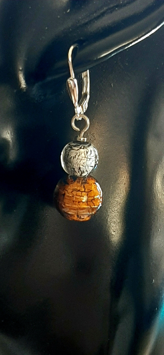 Die Formgebung der Ohrschmuck Glaselemente entsteht in freier Gestaltung vor dem Glasbrenner. Rainer Schrade, Glaskünstler der Galerie Glaswerk, verwendet zur Herstellung farbige Murano Glasstäbe, die mit Blattsilber, Blattgold und Aventurin unter hohen Temperaturen zu diesen Modeschmuck Unikaten geformt werden. Die Schmuckstücke dieser Ohrhänger haben einen Durchmesser von ca. 1cm und wiegen zusammen mit 925 Sterlingsilber Montur ca. 3g. Die Schmucksteine dieser Ohrhänger sind ist auf schwarzer Grundfläche verarbeitet.