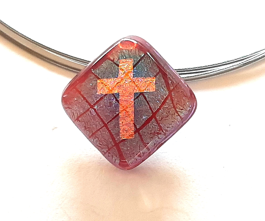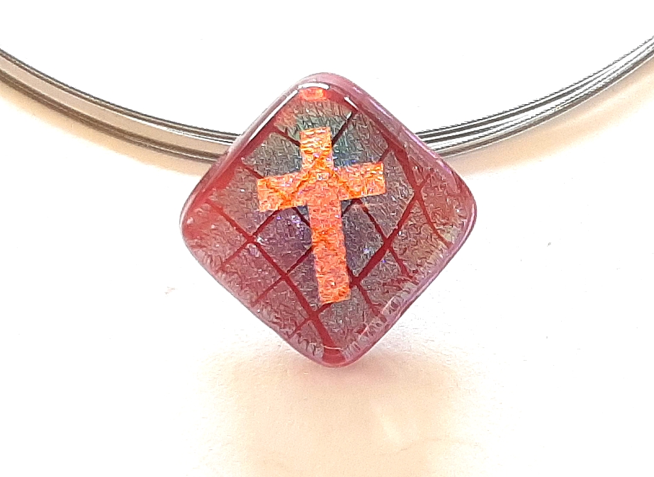 Diese Glasschmuck Halskette der Chakra Fashion Symbolschmuck Serie hat einen Anhänger aus Glas in der Größe von ca. 2cm x 2cm und wiegt ca. 10g. Die Grundfarbe dieses Anhängers ist rot mit wellenförmigen Untergrung WARP und das Symbol leuchtet in dichromatischem Gold, es erscheint dem Betrachter visuell schwebend auf dem farbigen Untergrund. Die Anhängermontur aus versilbertem Tombak (Messinglegierung aus Kupfer und Zink, versilbert) ist sicher mit dem Glasstück verarbeitet.