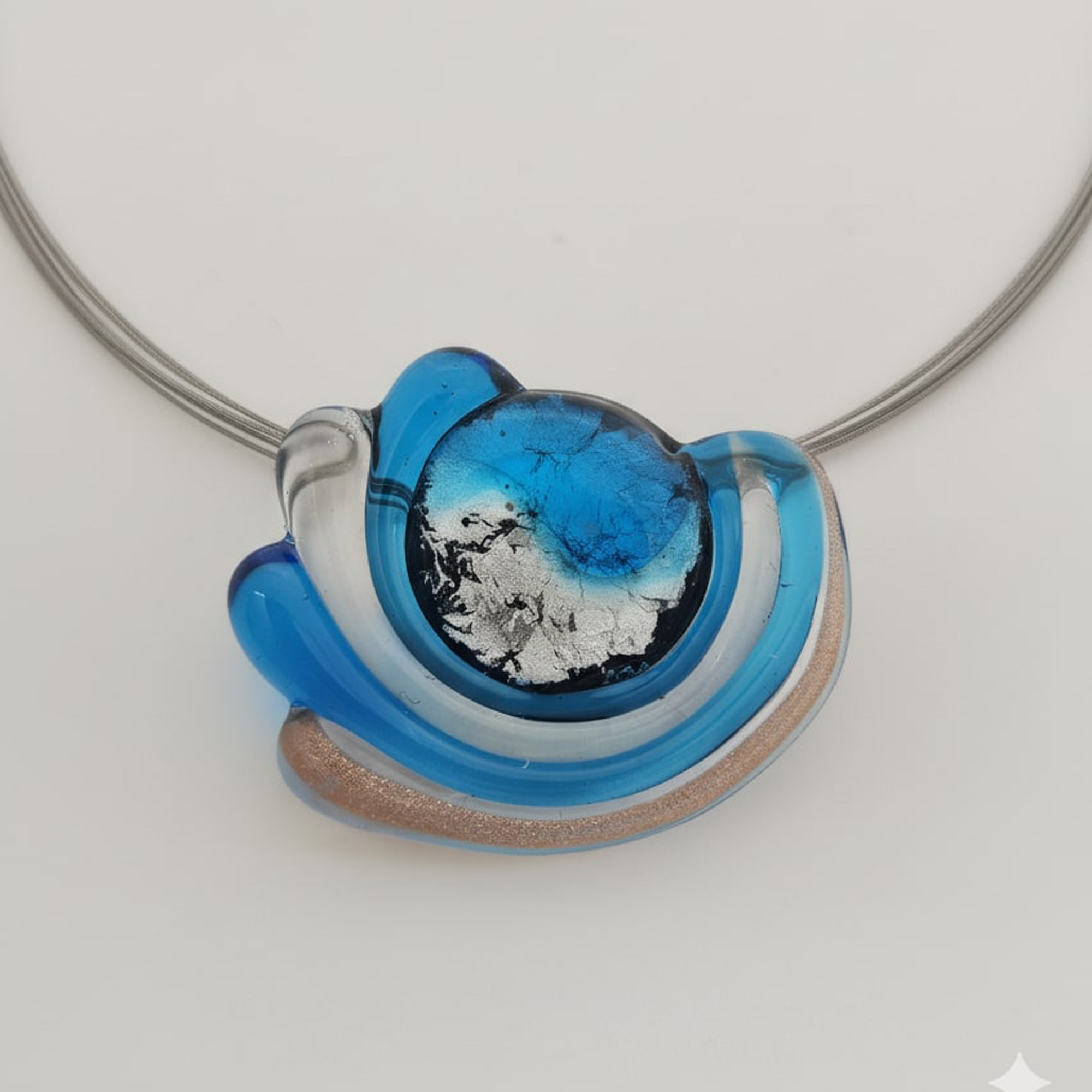 Rainer Schrade, Glaskünstler der Galerie Glaswerk, verwendet zur Herstellung farbige Murano Glasstäbe die mit Blattsilber, Blattgold und Aventurin unter hohen Temperaturen zu diesem Modeschmuck Unikat geformt werden.
